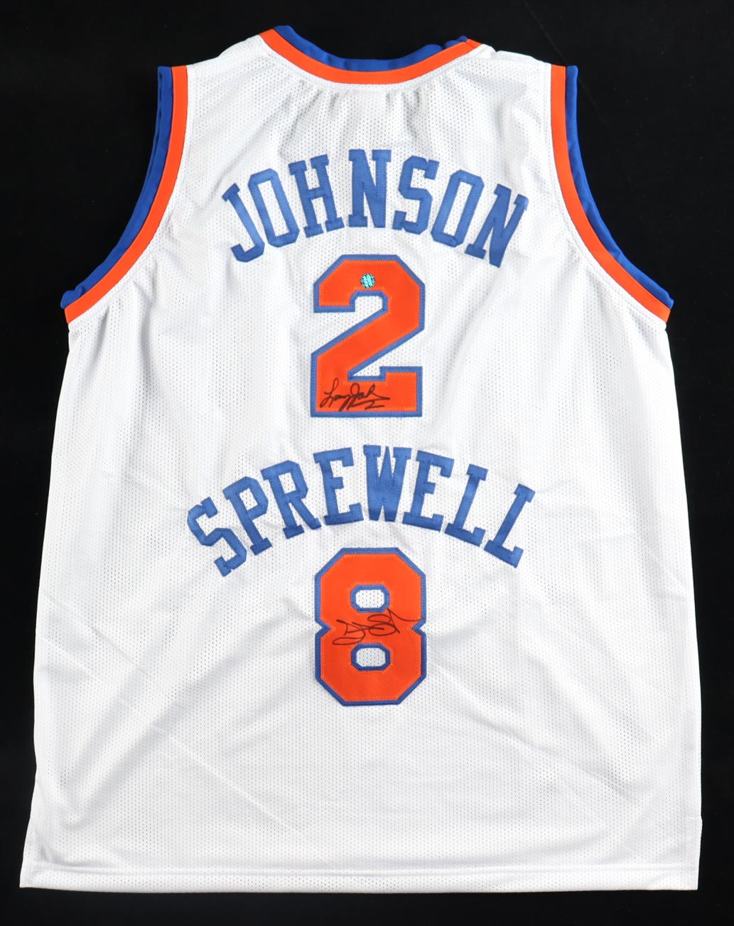 Custom jersey with everything sewn on, size XL. Hand-signed by Larry Johnson and Latrell Sprewell.