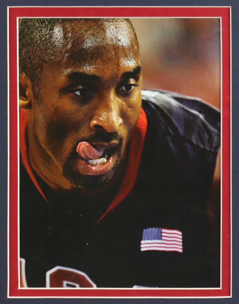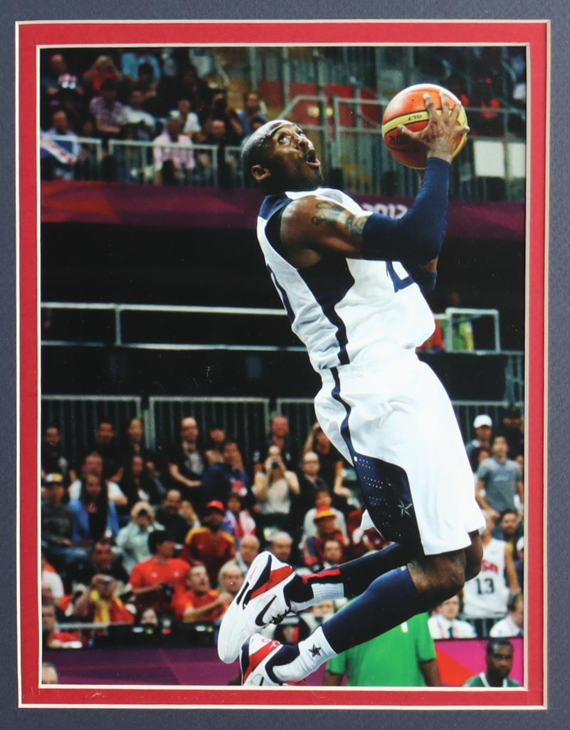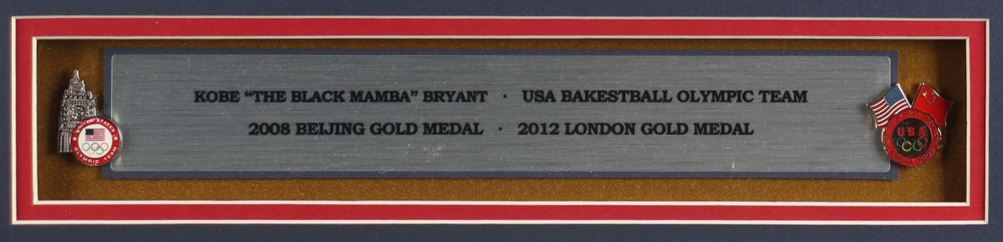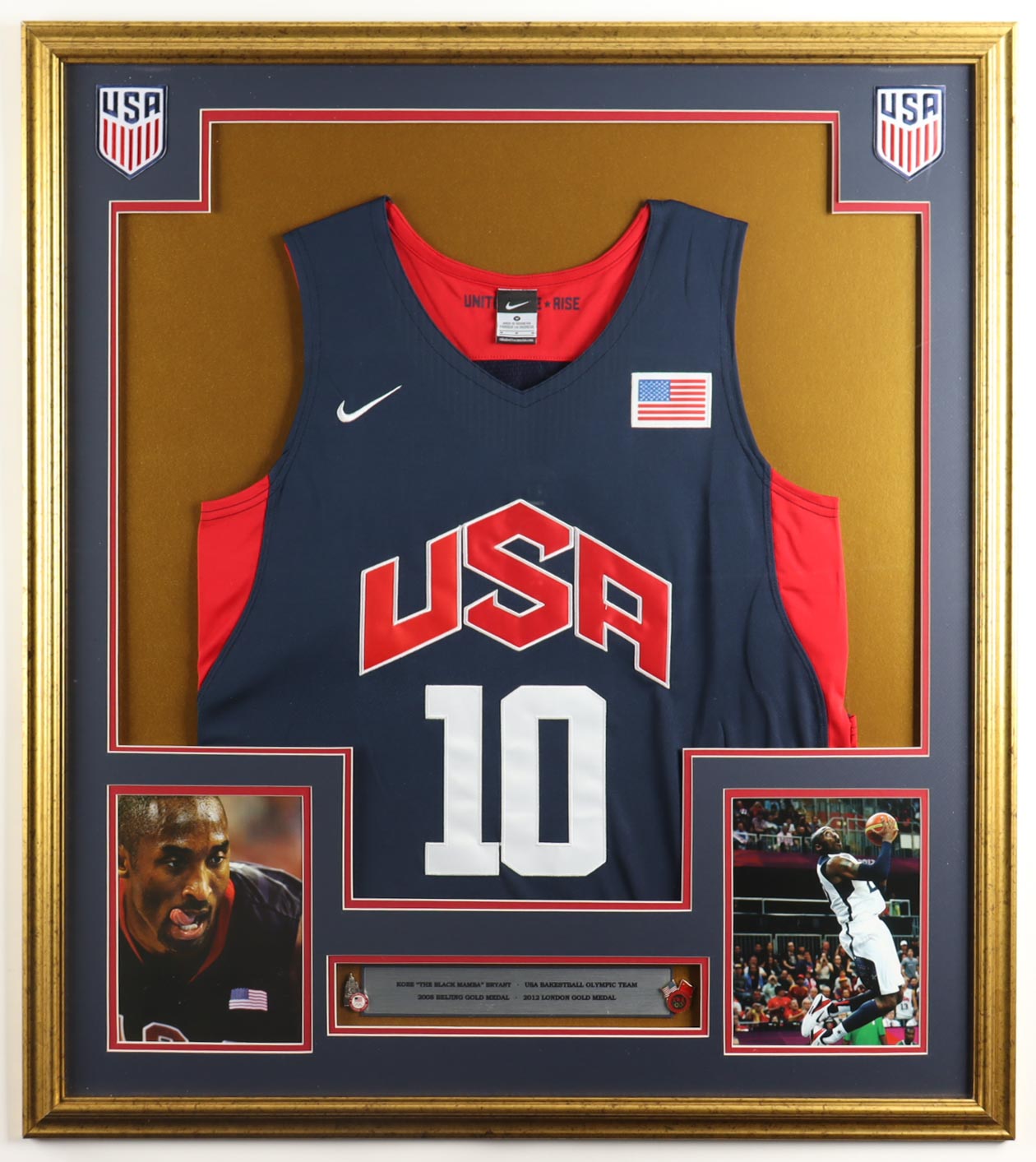 Custom frame measures approximately 32" x 36" in size and features a Kobe Bryant (D. 2024, Team USA, HOF) Nike jersey, as well as a London and Beijing Olympics pin.