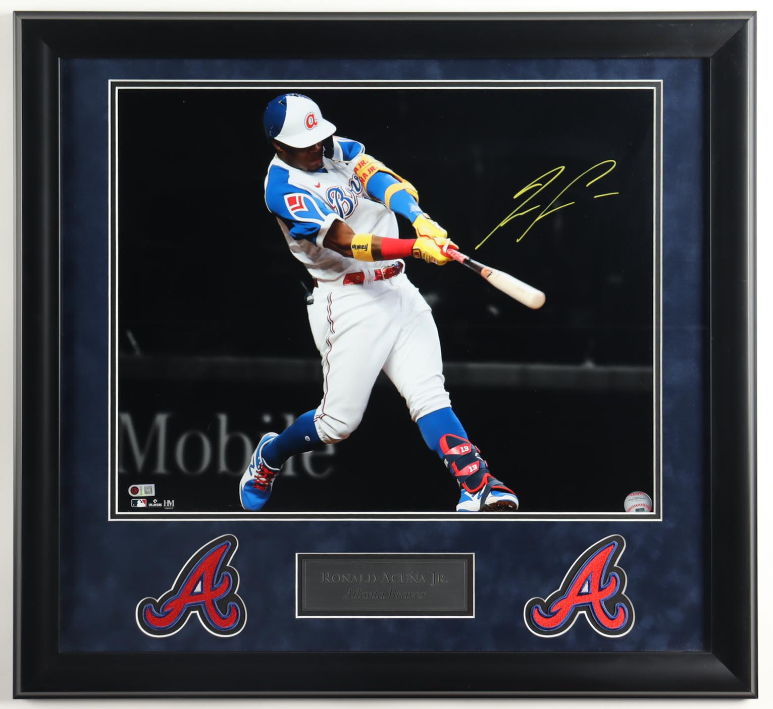Custom frame measures approximately 25" x 27" in size and features a photo hand-signed by Ronald Acuna Jr. (Atlanta Braves).
