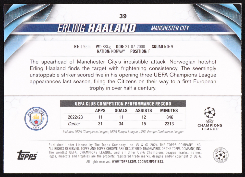 Erling Haaland 2023-24 Topps Chrome UEFA Club Competitions Pink Prism Refractors #39 #84/99
