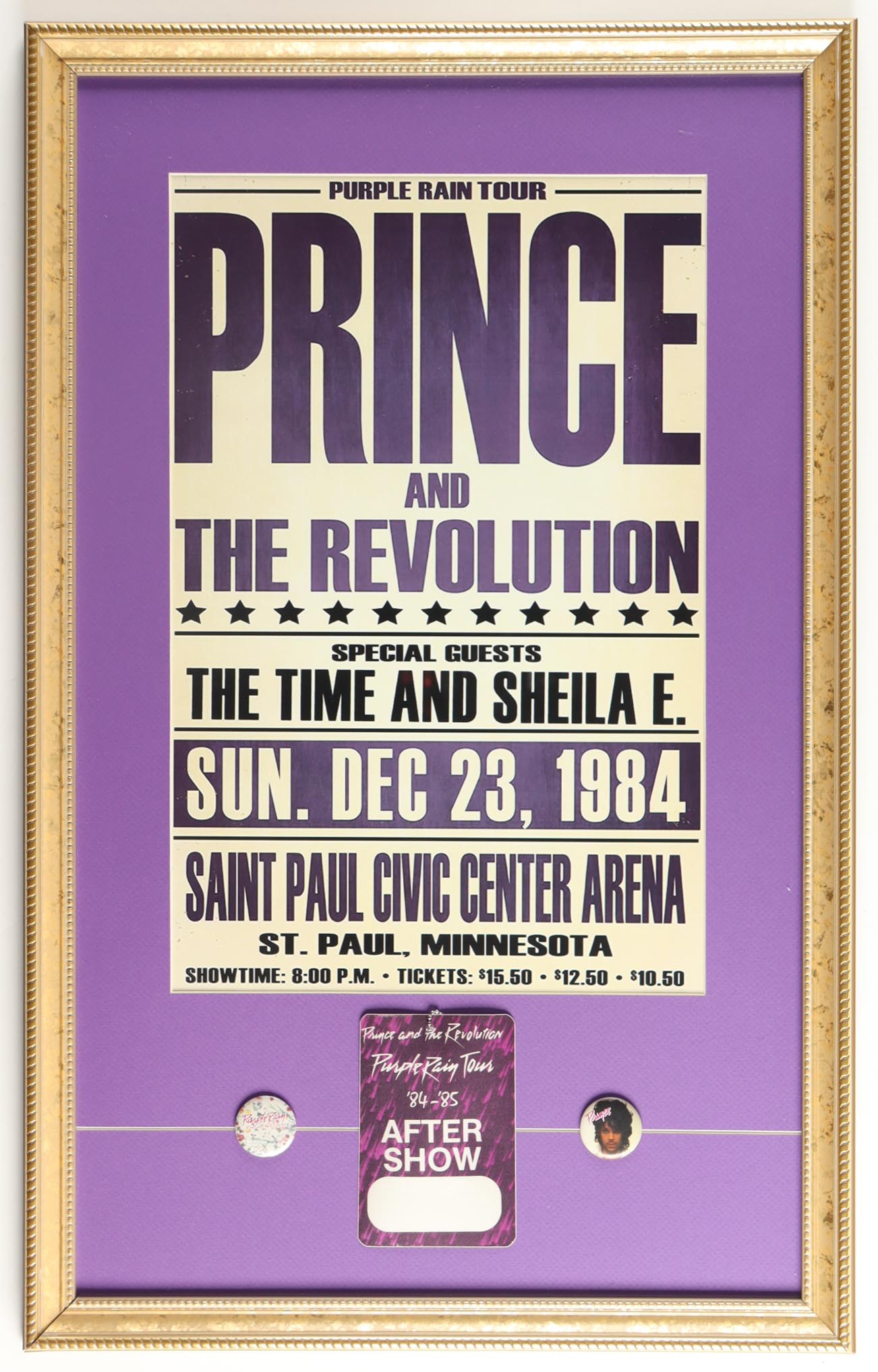 Prince and the Revolution "Purple Rain Tour" Custom Framed Concert Poster Print with 1984-85 After Show Pass & (2) Vintage Prince Pins