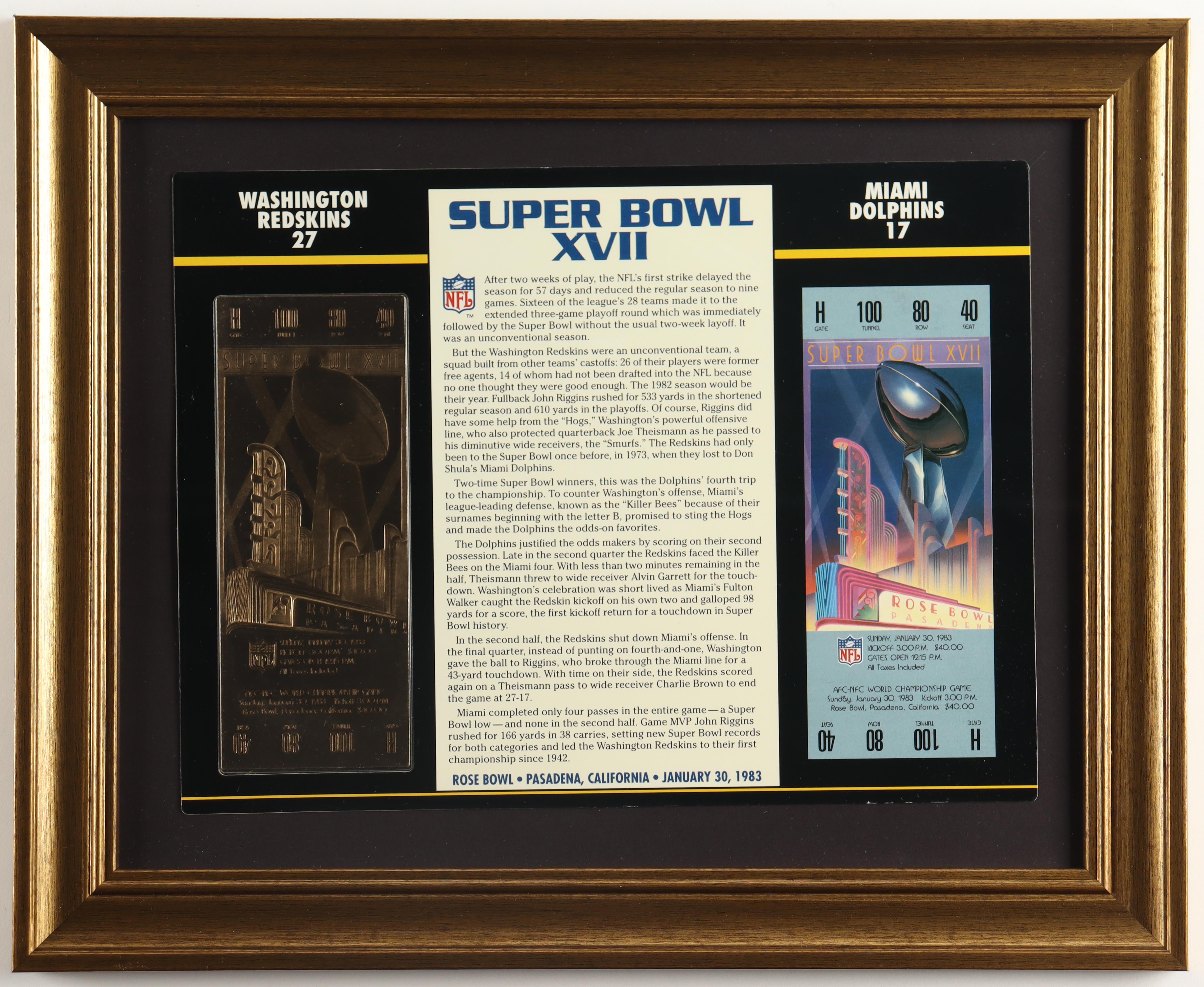 Custom framed display measures approximately 13.25" x 16.25" in size and features a Super Bowl XVII 23kt gold ticket. Please note, the display is unsigned.