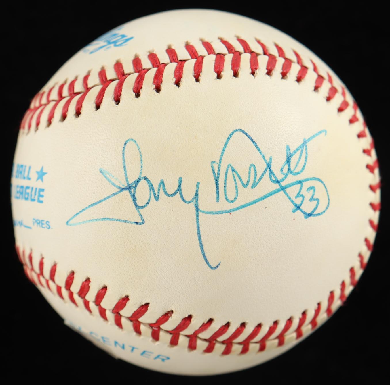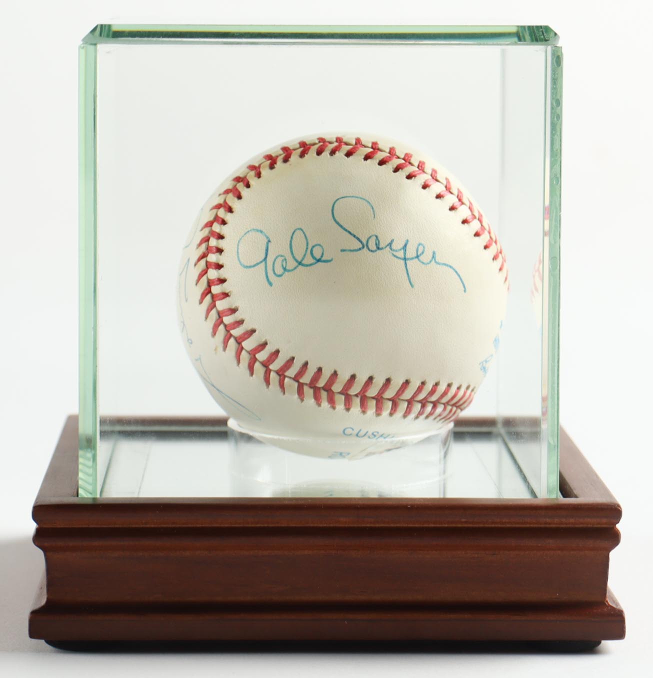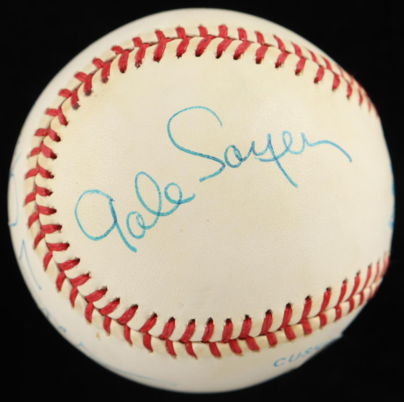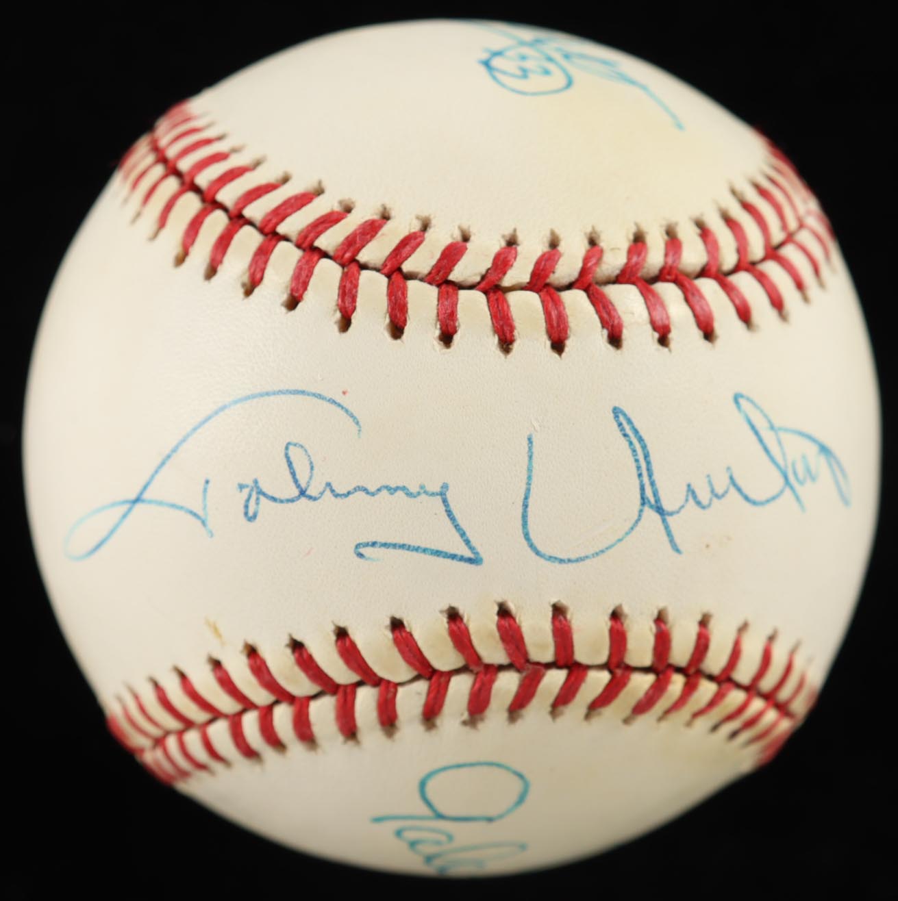 Rawlings Official American League Baseball has been hand-signed by Gale Sayers (D. 2020, Chicago Bears, HOF), Johnny Unitas (D. 2002, Baltimore Colts, HOF) and Tony Dorsett (Dallas Cowboys, HOF). Please note, the baseball is naturally toned.