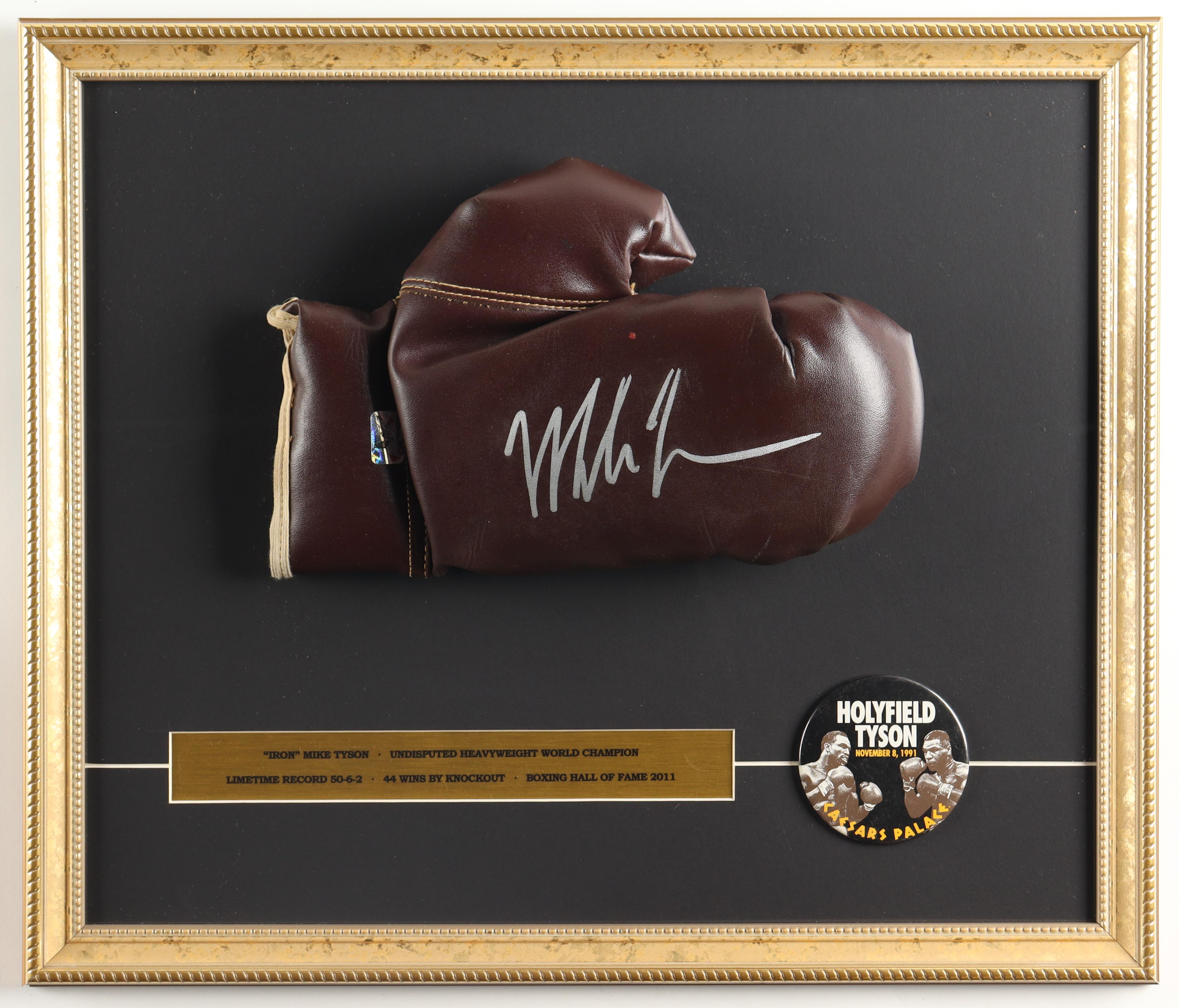 Mike Tyson Signed Custom Framed Vintage Boxing Glove Display with Official 1991 Caesar's Palace "Holyfield vs Tyson" Pin (Tyson)