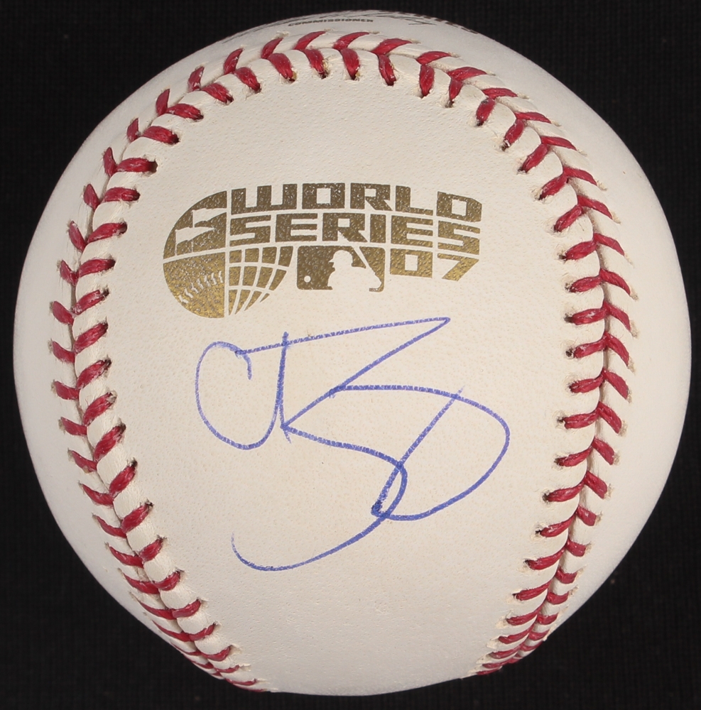 Official 2007 World Series Logo baseball has been hand signed in blue ink pen by Curt Schilling. (Red Sox)