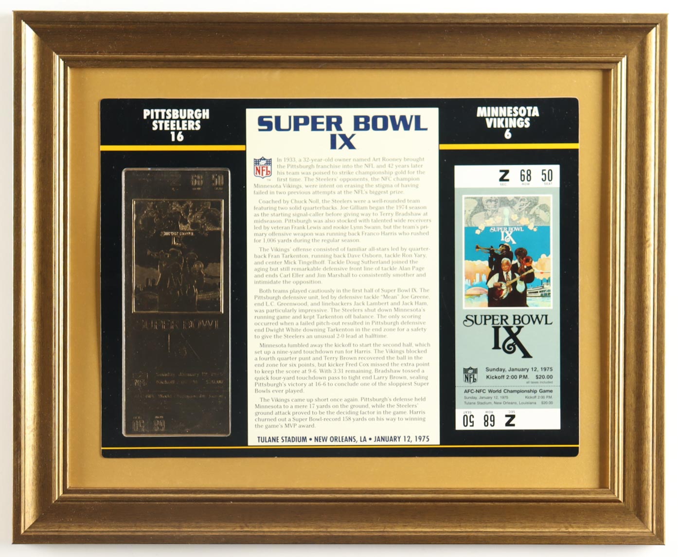 1975 Super Bowl IX Commemorative Card with 22KT Gold Ticket Custom Framed Display