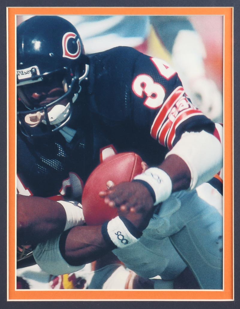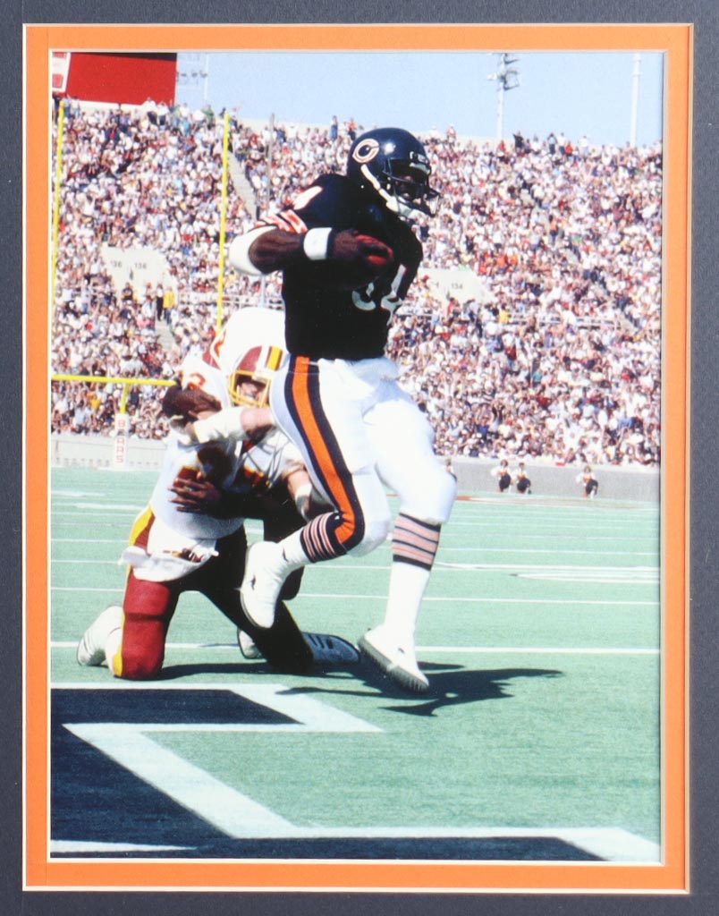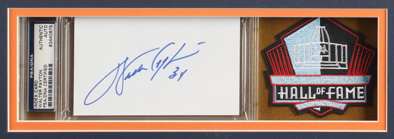 Custom frame measures approximately 33" x 37" in size and features a cut that has been hand-signed by Walter Payton (D. 1999, Chicago Bears, HOF). Includes pin and logo patches.