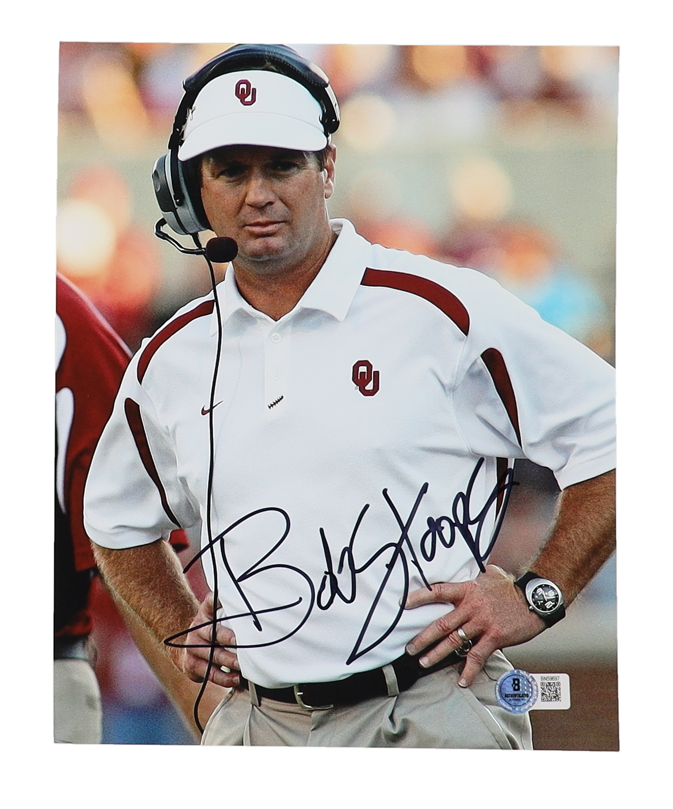 Photo measures 8" x 10" in size and has been hand-signed by Bob Stoops (Former Head Coach).