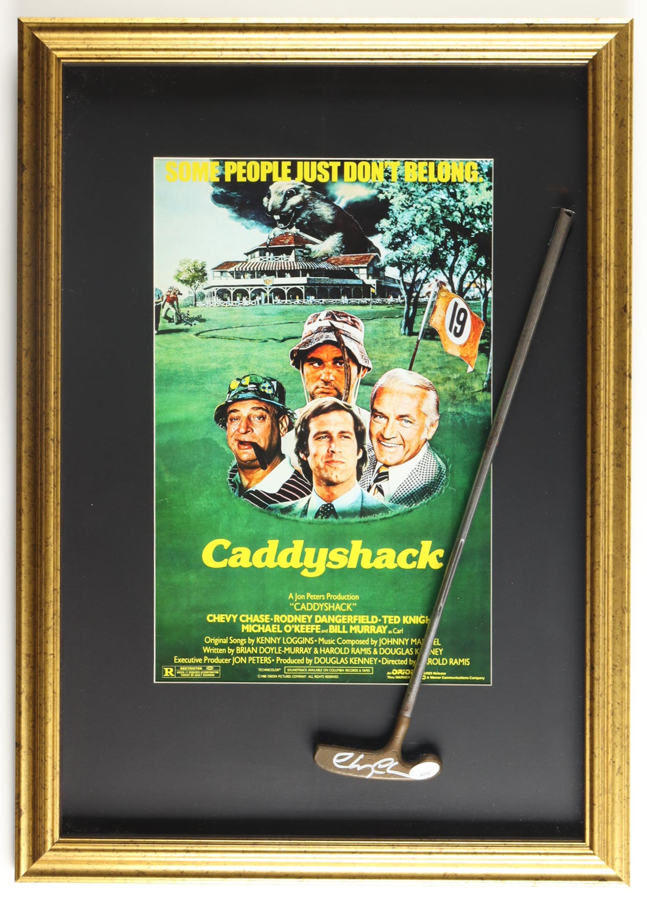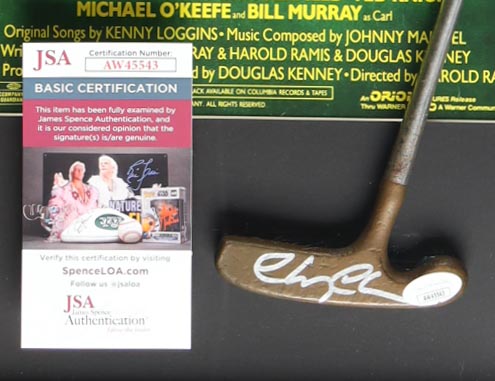 Custom frame measures approximately 20" x 28" in size and features a cut-down putter that has been hand-signed by Chevy Chase.