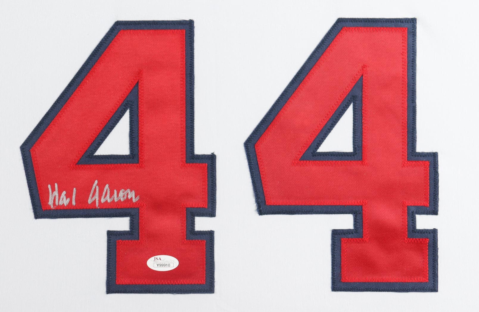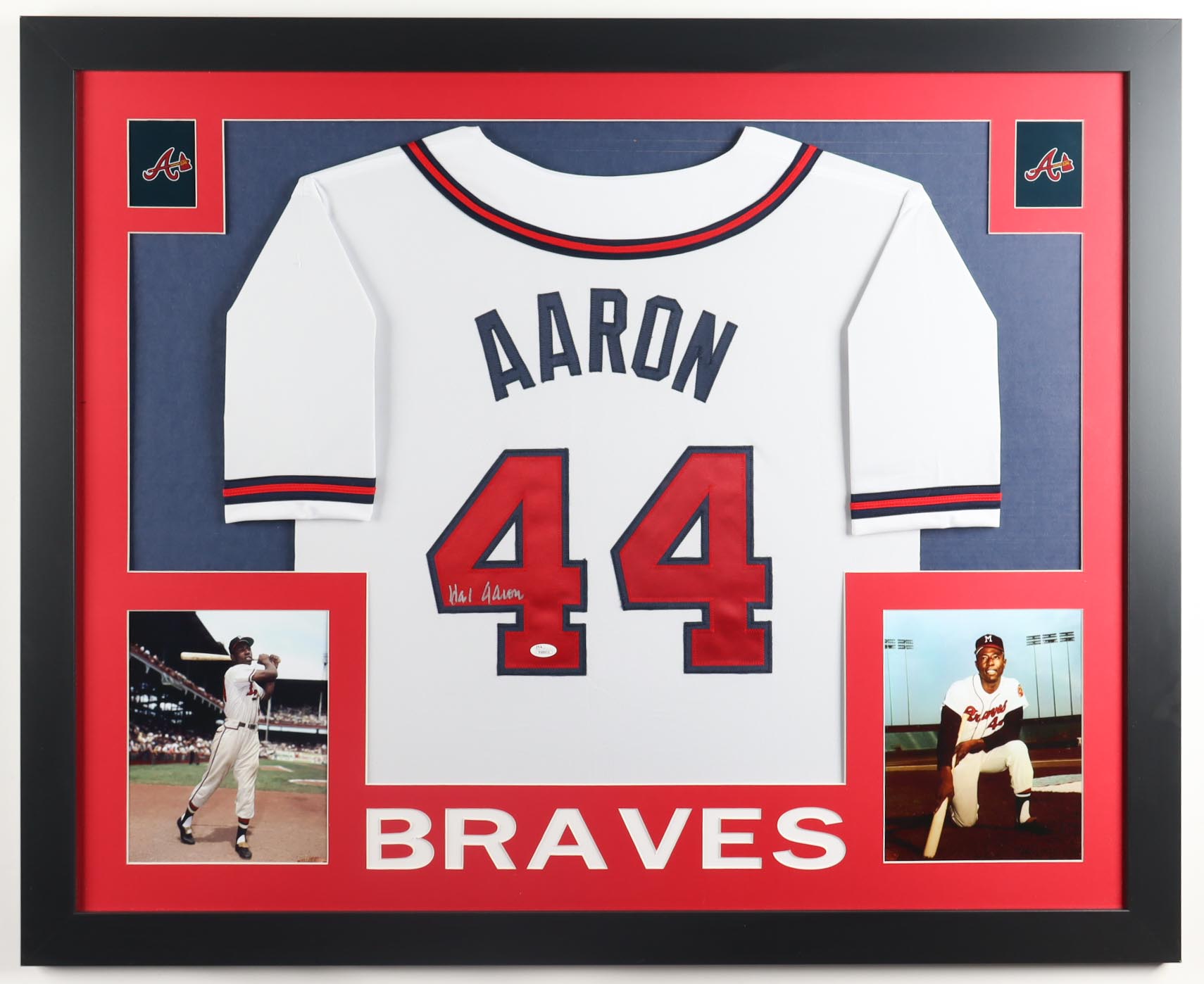 Custom frame measures 34" x 42" in size and features a jersey hand-signed by Hank Aaron (D. 2021, HOF). Please note that the 8" x 10" photos may be in different order.