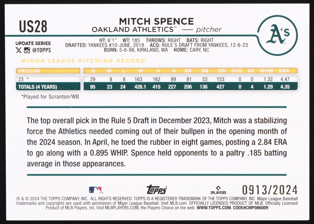 Mitch Spence 2024 Topps Update Gold #US28 #0913/2024 RC