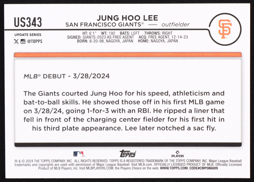 Jung Hoo Lee 2024 Topps Update #US343 RC