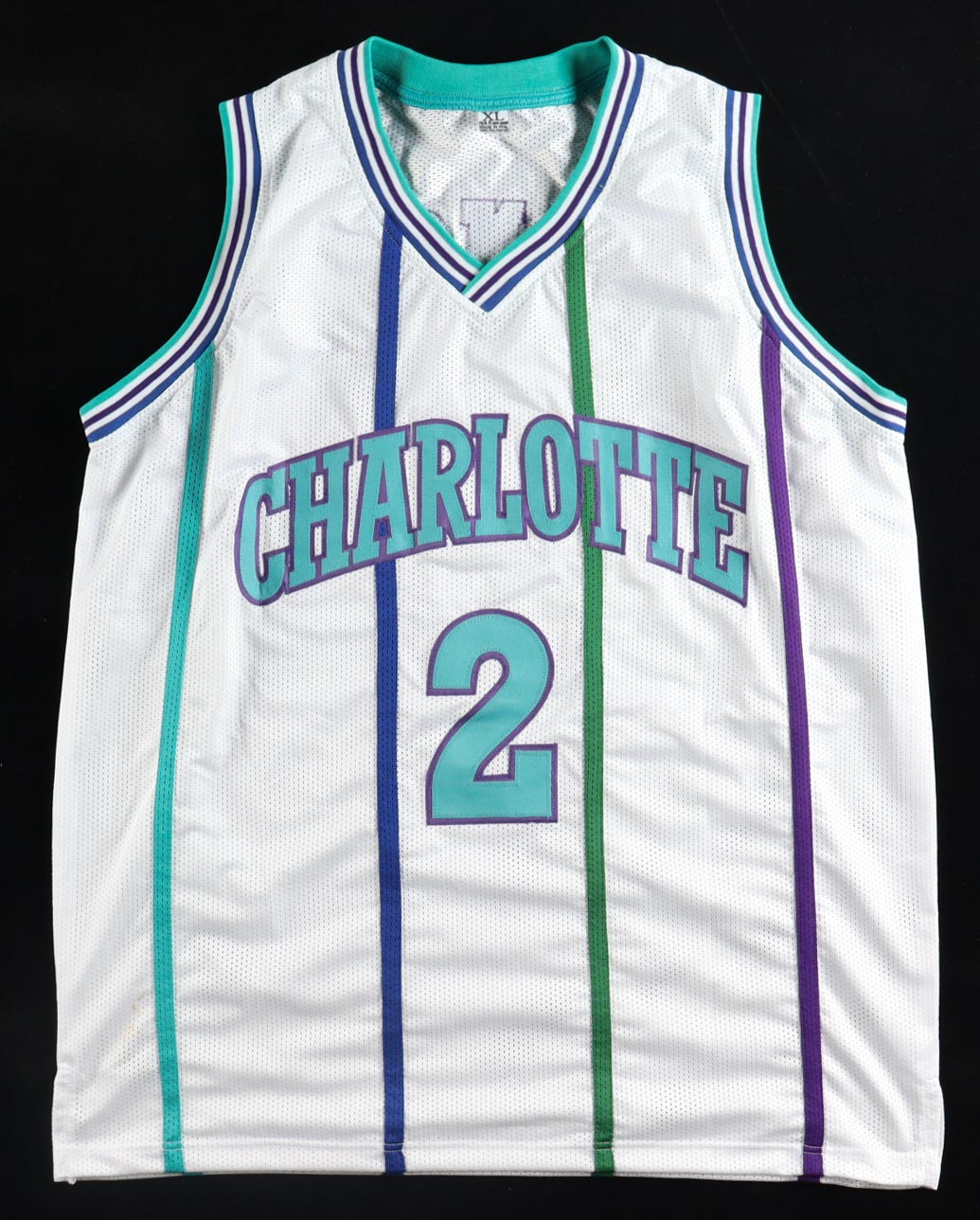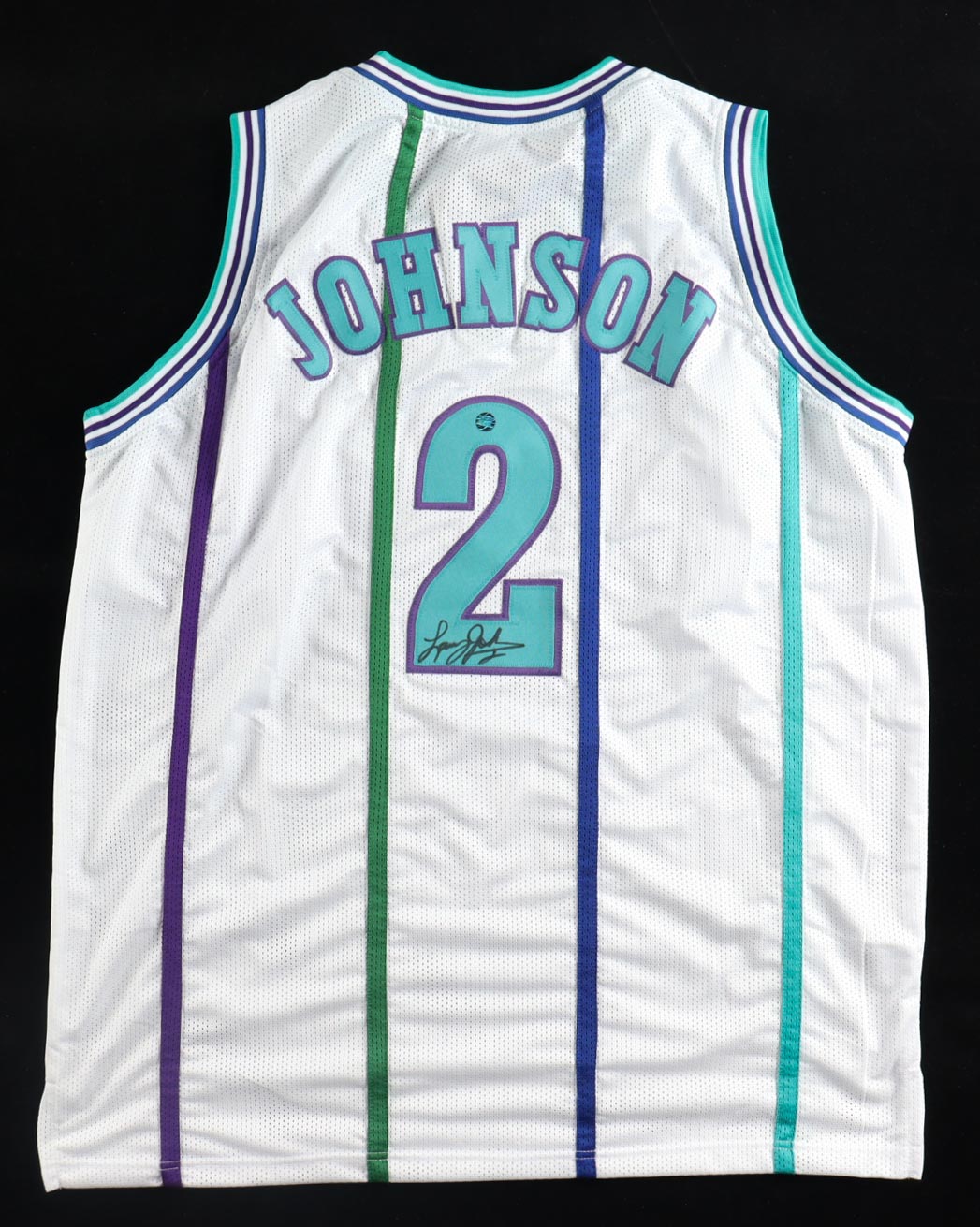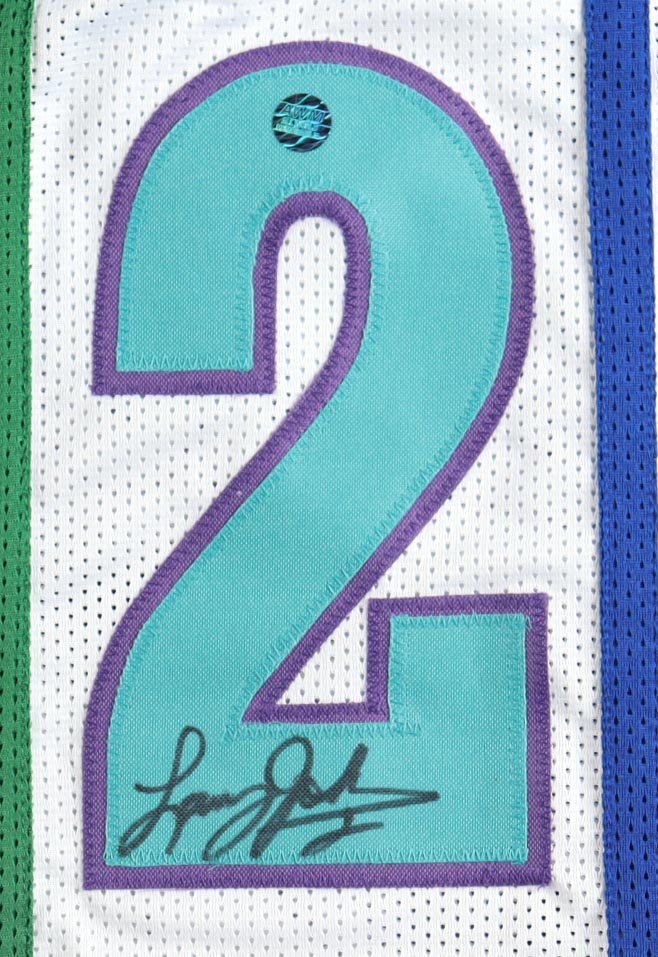 Custom jersey with everything sewn on, size XL. Hand-signed by Larry Johnson.