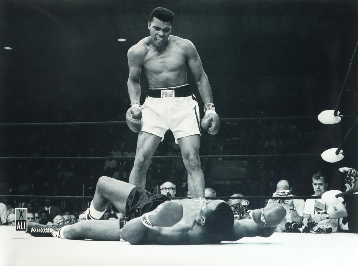 This photo, commemorating Ali and Sonny Liston's anticipated fight, is part of sports history. Taken during the first-round knockout of his championship fight against Liston, this photo is sure to complement any sports memorabilia collection. This is a licensed photograph on Kodak Professional Endura paper. Measures approximately 40" x 30" (no border).