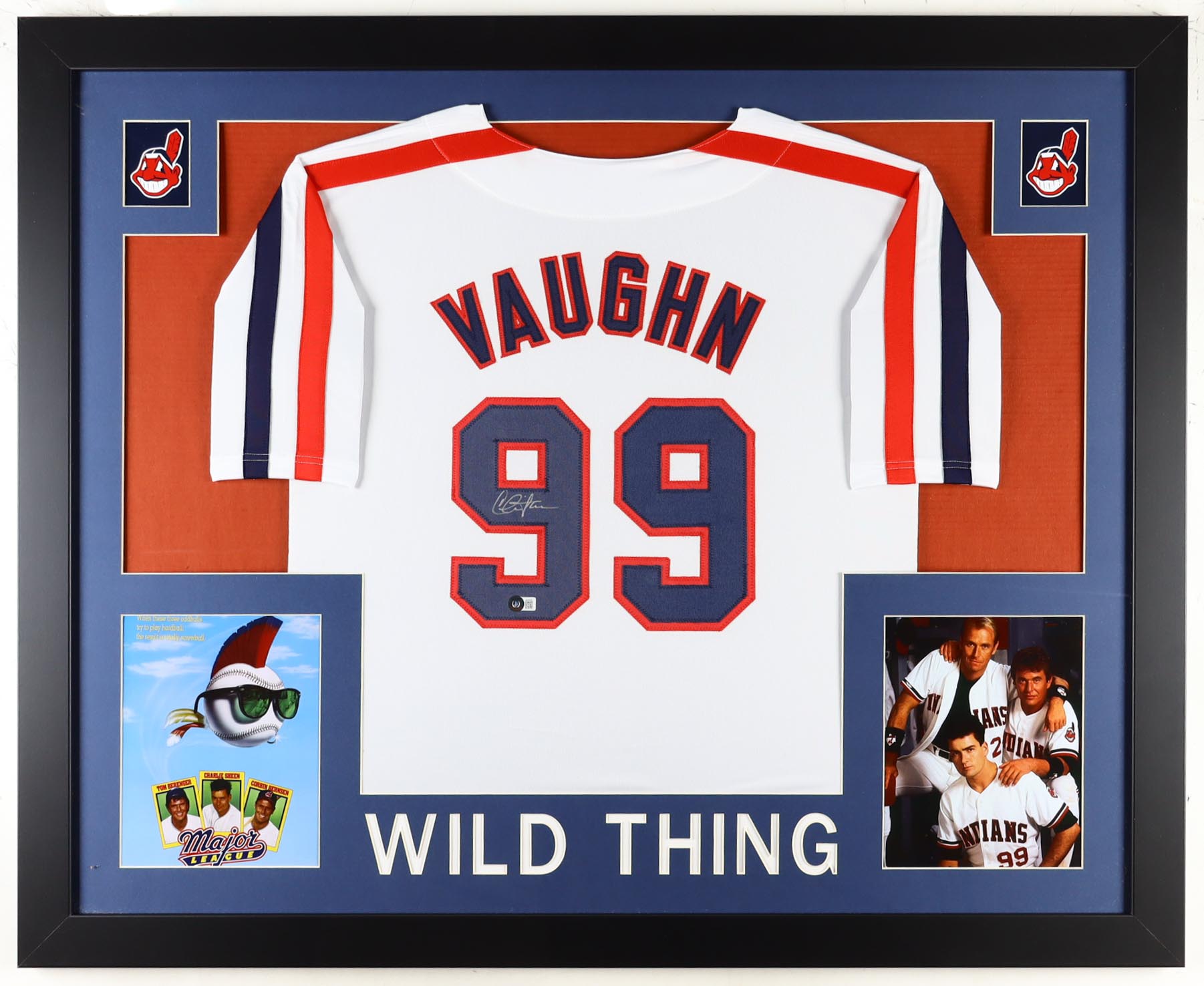 Custom frame measures approximately 35" x 43" in size and features a jersey that has been hand-signed by Charlie Sheen (Ricky "Wild Thing" Vaughn).