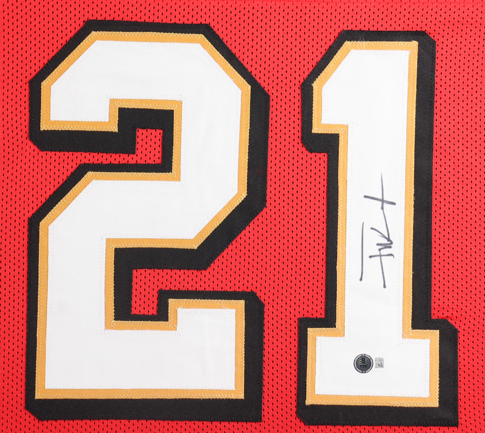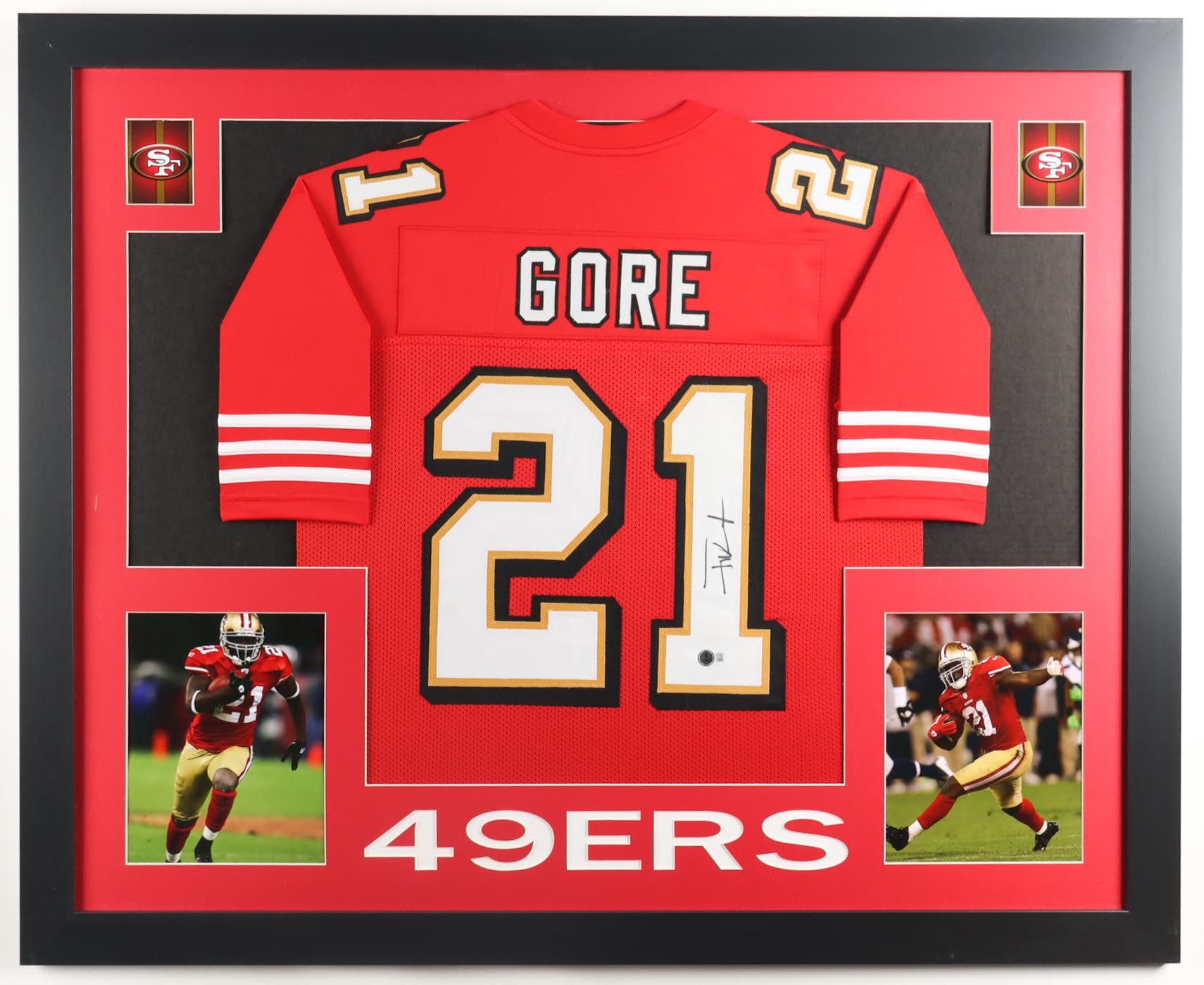 Custom frame measures approximately 35" x 43" in size and features a jersey hand-signed by Frank Gore. Please note that the 8" x 10" photos may be in different order.