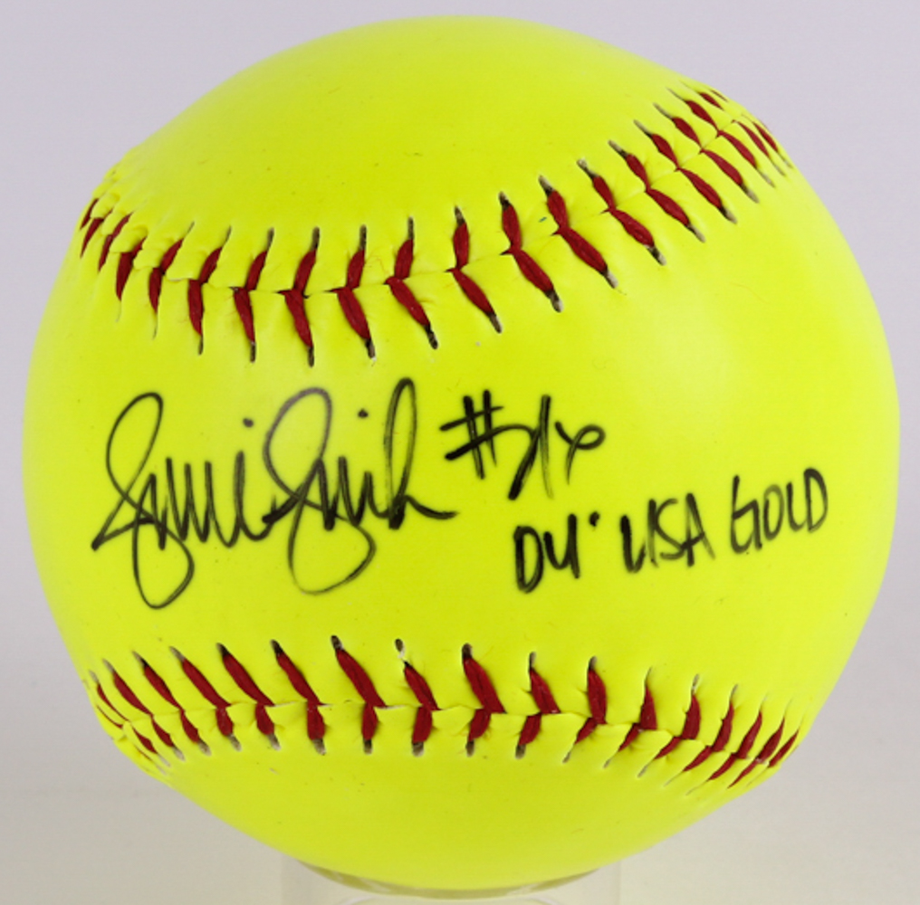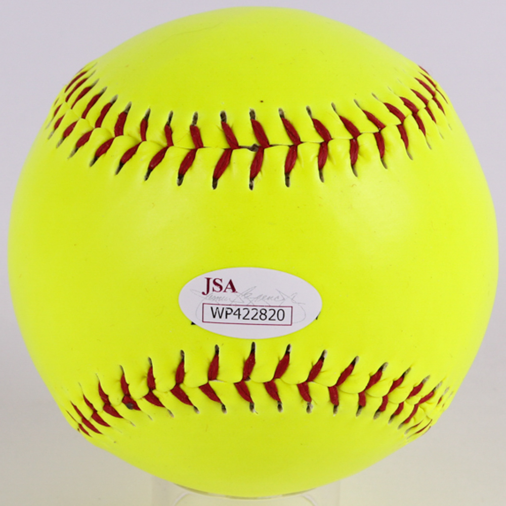 Softball has been hand-signed and inscribed in black felt tip pen by Jennie Finch (Team USA).