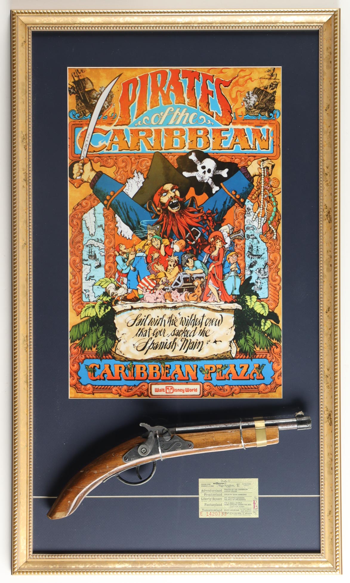 Disneyland "Pirates of the Caribbean" Custom Framed Ride Poster Print Display with Vintage Park Ticket & Replica Prop Pistol