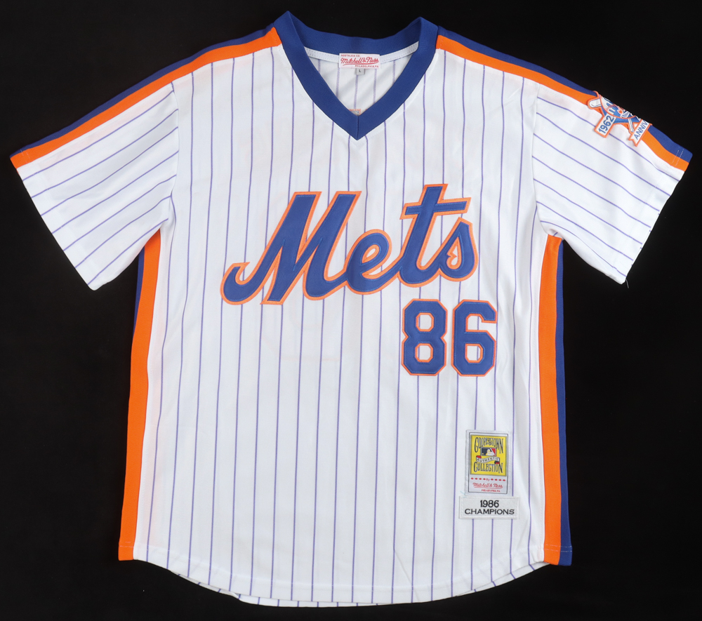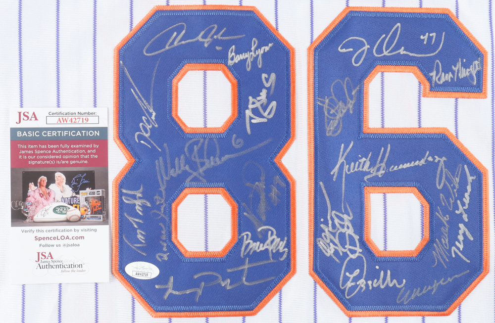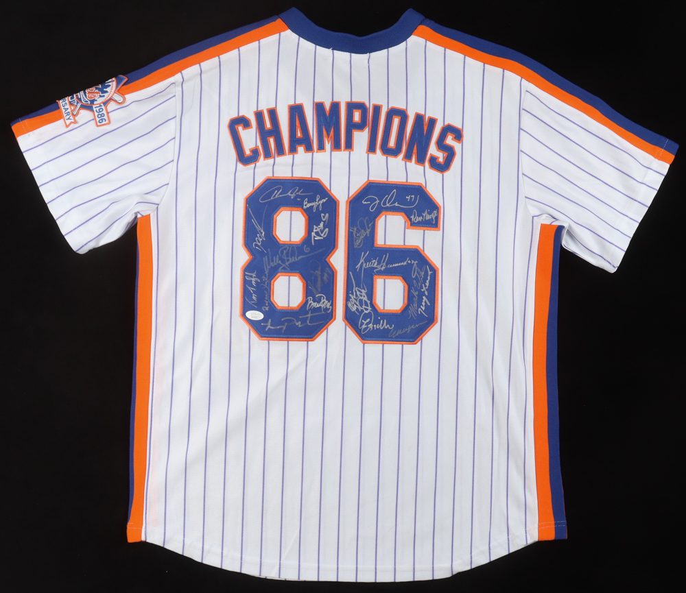 Mitchell & Ness style jersey with everything sewn on, size L. Hand-signed by (20) featuring Keith Hernandez, Lenny Dykstra, Lee Mazzelli, Jesse Orosco, Dave Magadan, Mookie Wilson, Wally Backman, Kevin Mitchell, Ed Lynch, Howard Johnson, Rafael Santana, Leroy Neiman, Doug Sisk, Darryl Strawberry, Doc Gooden, Terry Leach, Tim Teufel, Barry Lyons, Ray Knight, & Bruce Berenyi