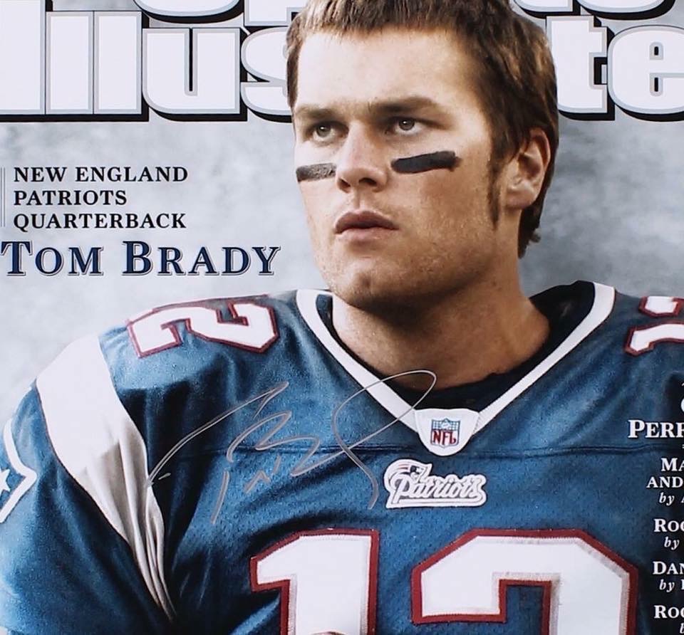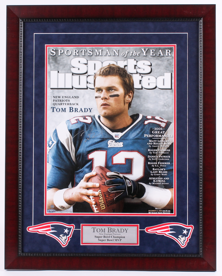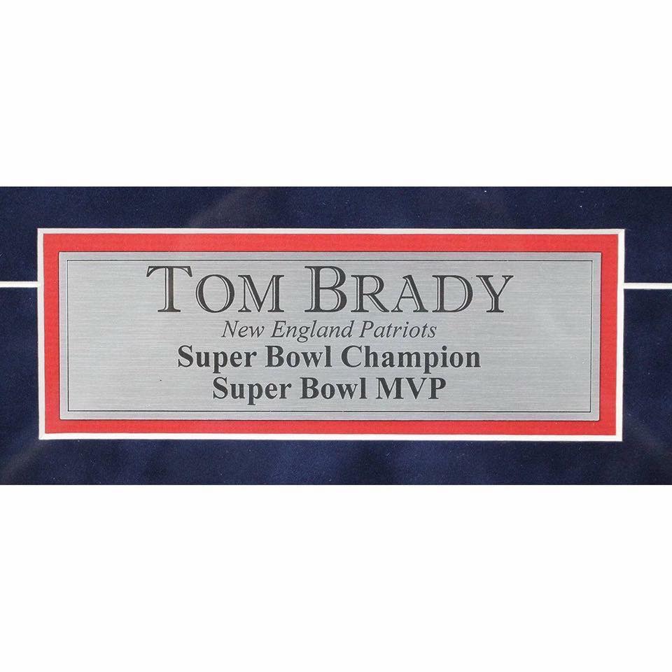 Custom framed photo display measures approximately 23.25" x 29.25" in size and has been hand-signed in silver paint pen by Tom Brady. The display also includes (2) New England Patriots patches.