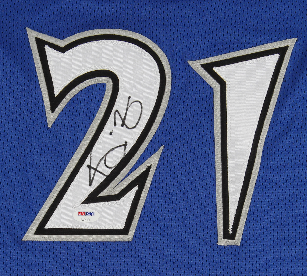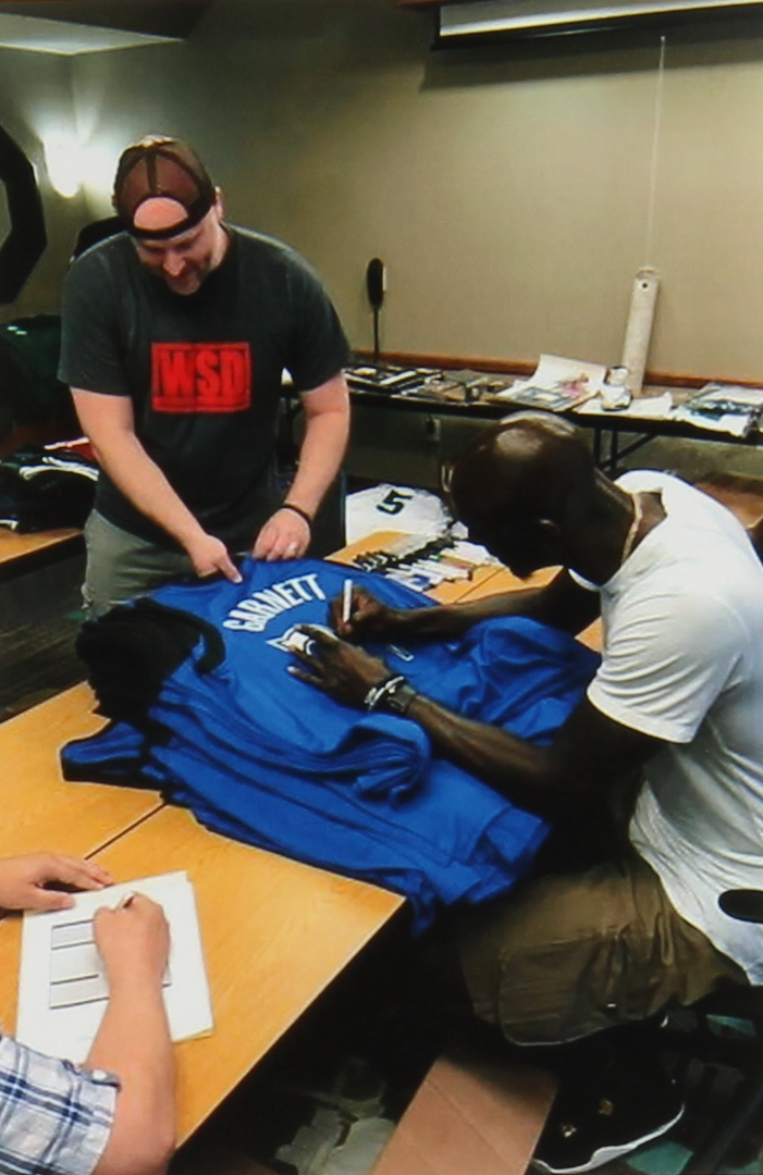 Custom on-court style jersey. Everything is sewn on, size XL. Hand-signed in black felt-tip pen by Kevin Garnett.