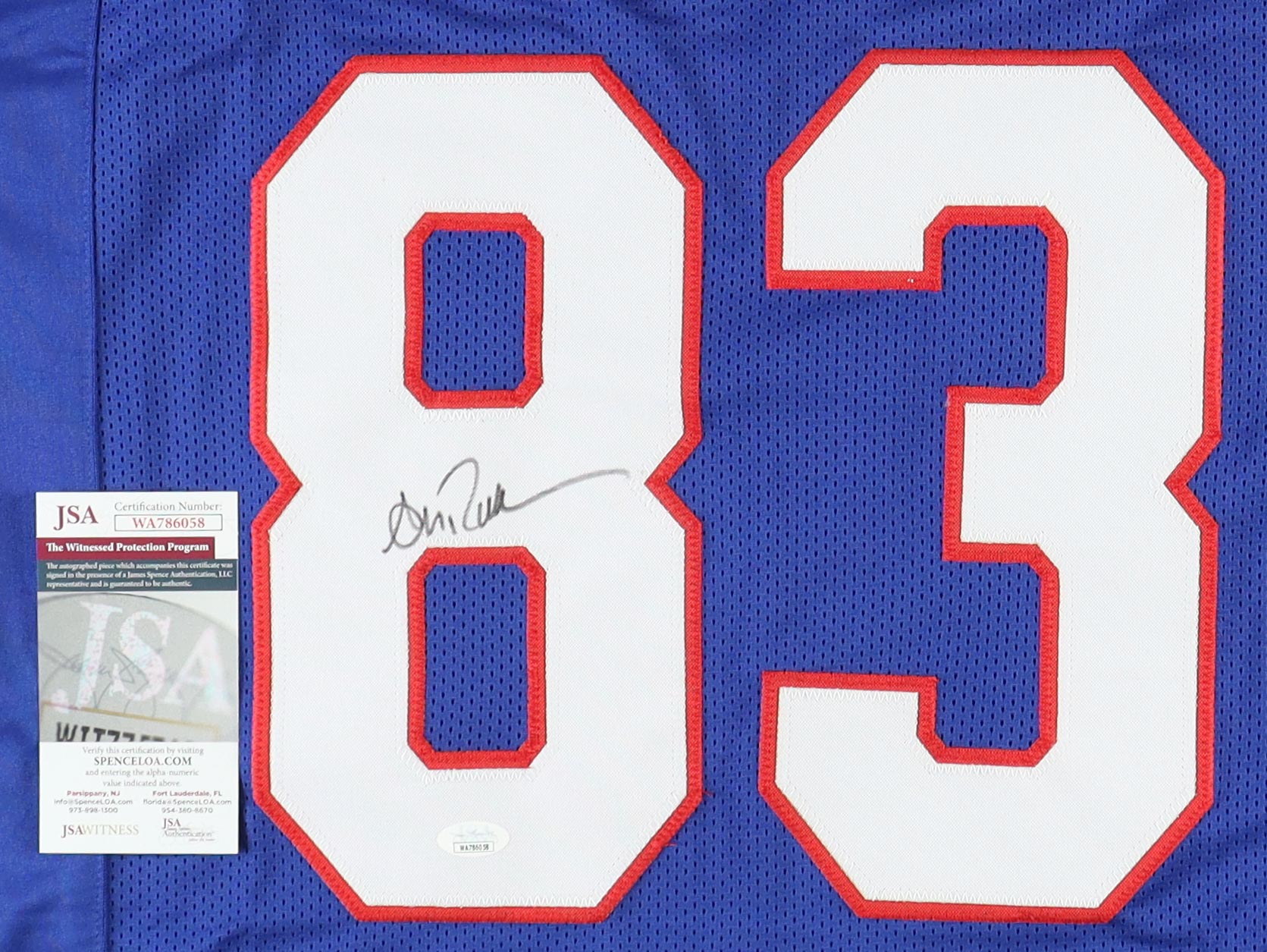 Custom jersey with everything sewn on, size XL. Hand-signed by Andre Reed (HOF). Reed's career highlights have been custom stitched onto the back of the jersey below the reverse numbers.