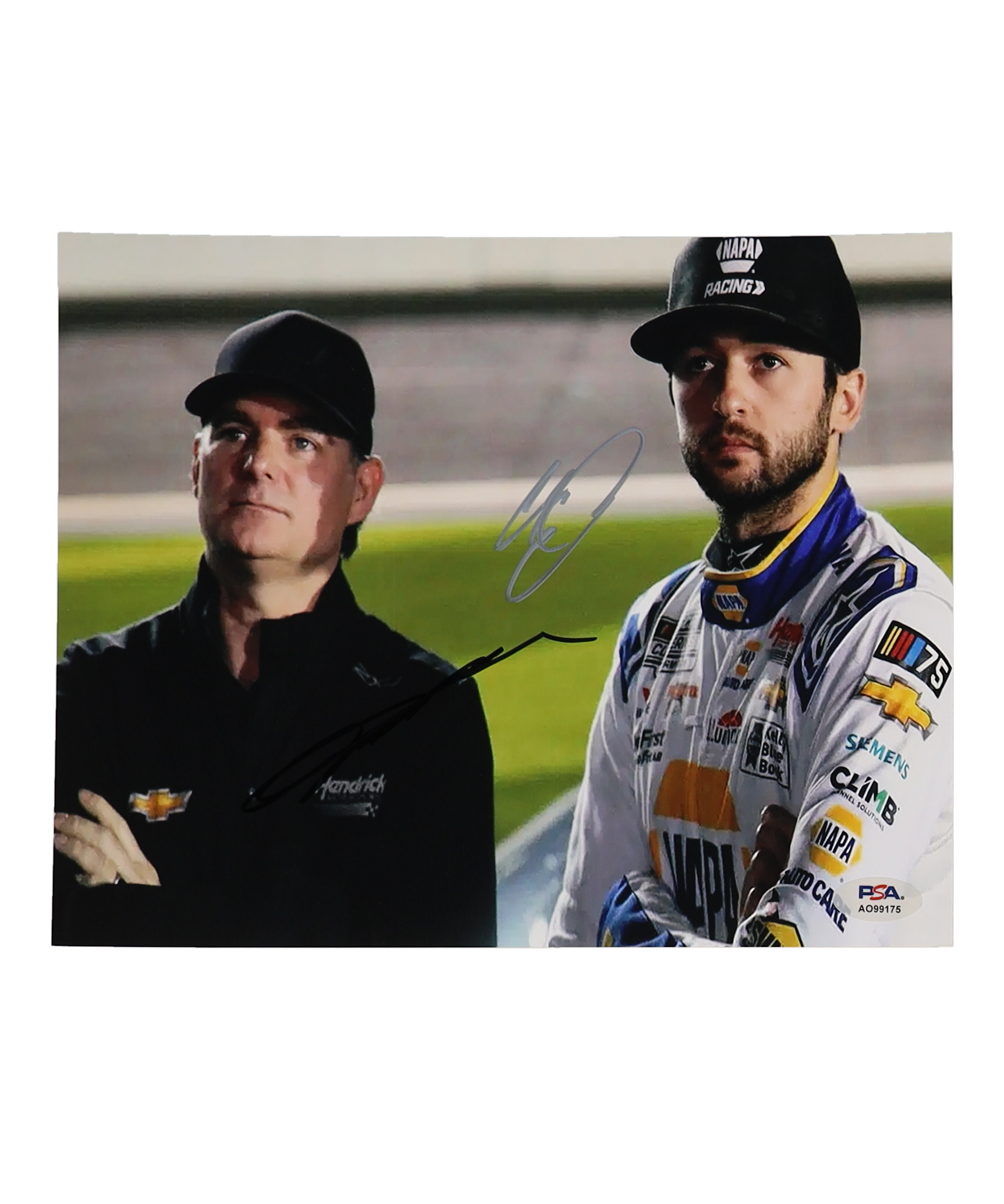 Photo measures 8" x 10" in size and has been hand-signed by Jeff Gordon (HOF) and Chase Elliott.