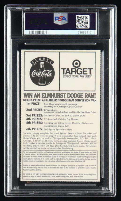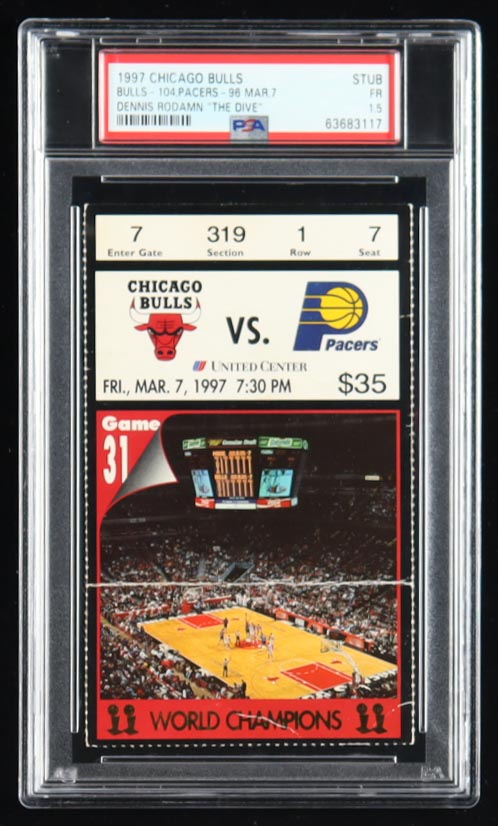 Original March 7, 1997 Chicago Bulls game ticket from Dennis Rodman's "The Dive" iconic game! This ticket has been encapsulated and graded by PSA as a 1.5 (FR). Please note, the ticket is not signed.