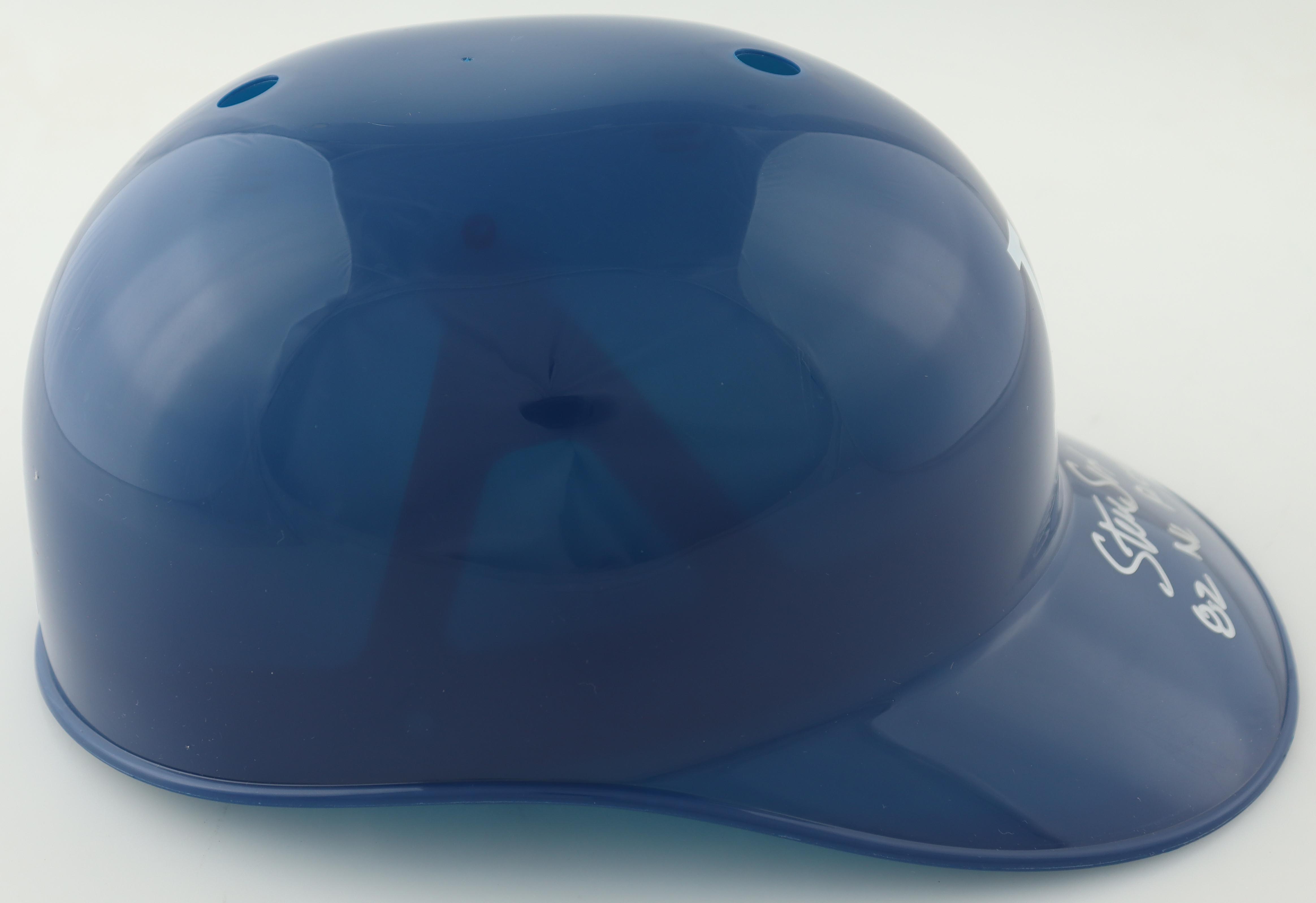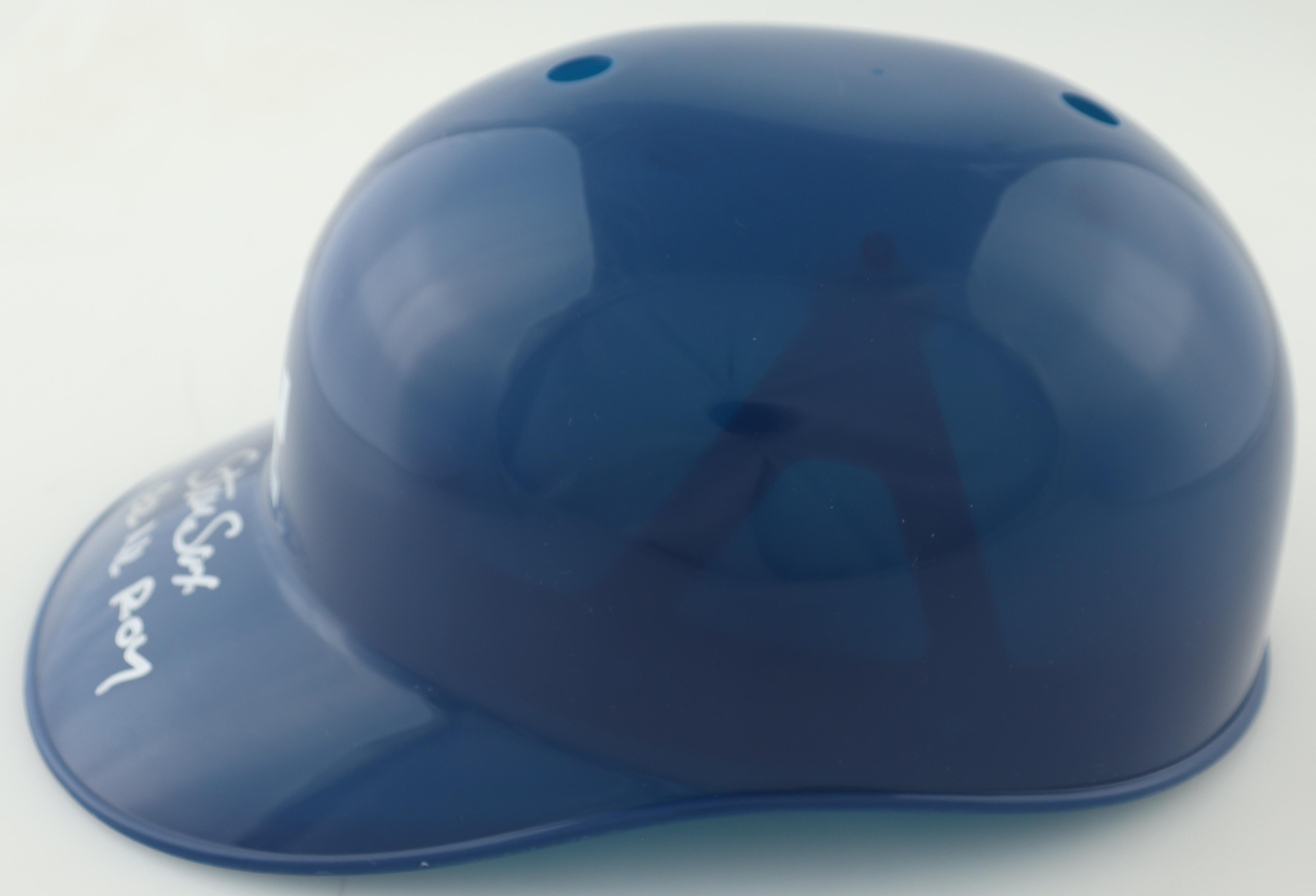 Los Angeles Dodgers full-size replica souvenir batting helmet. Hand-signed and inscribed by Steve Sax.