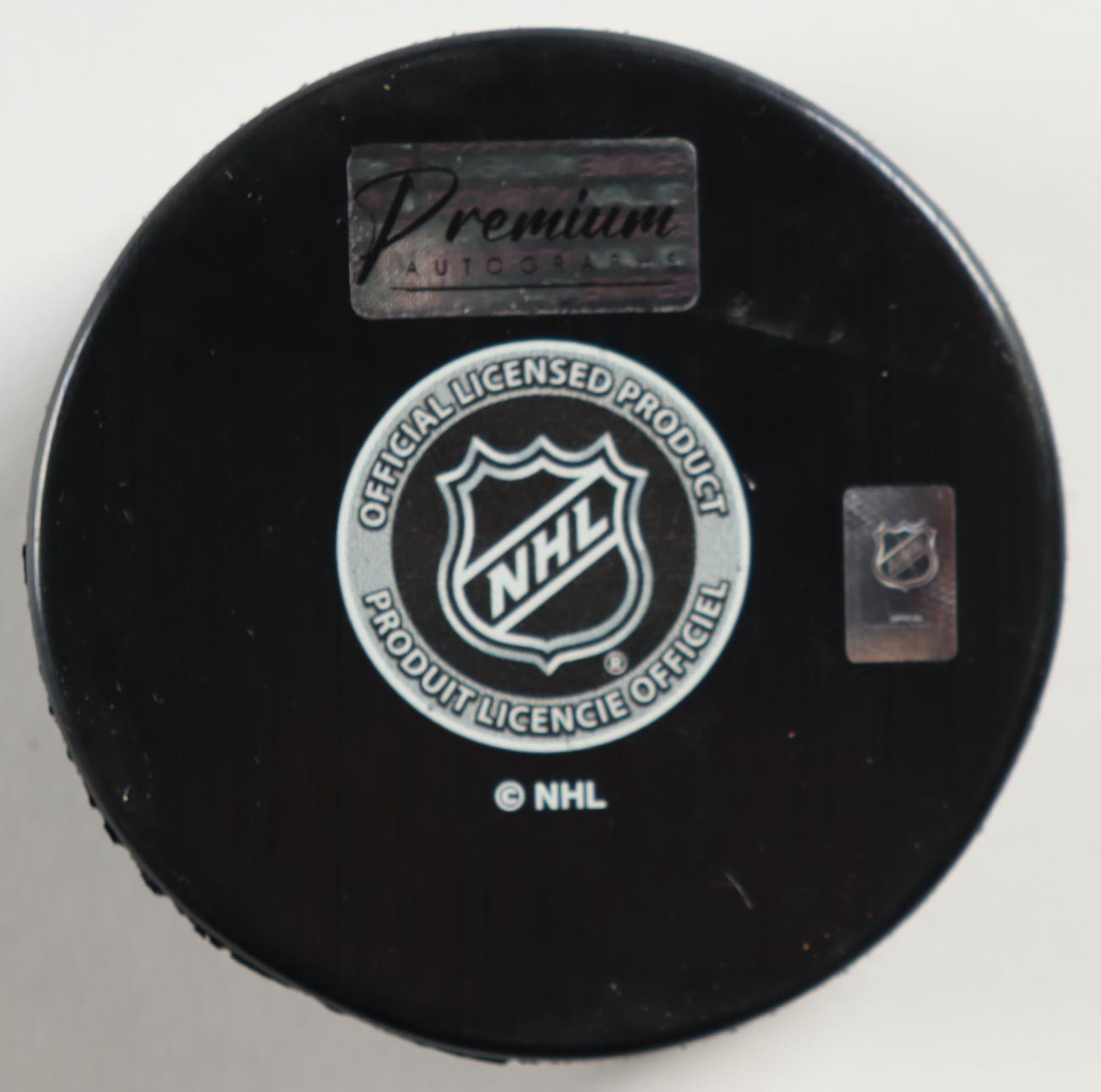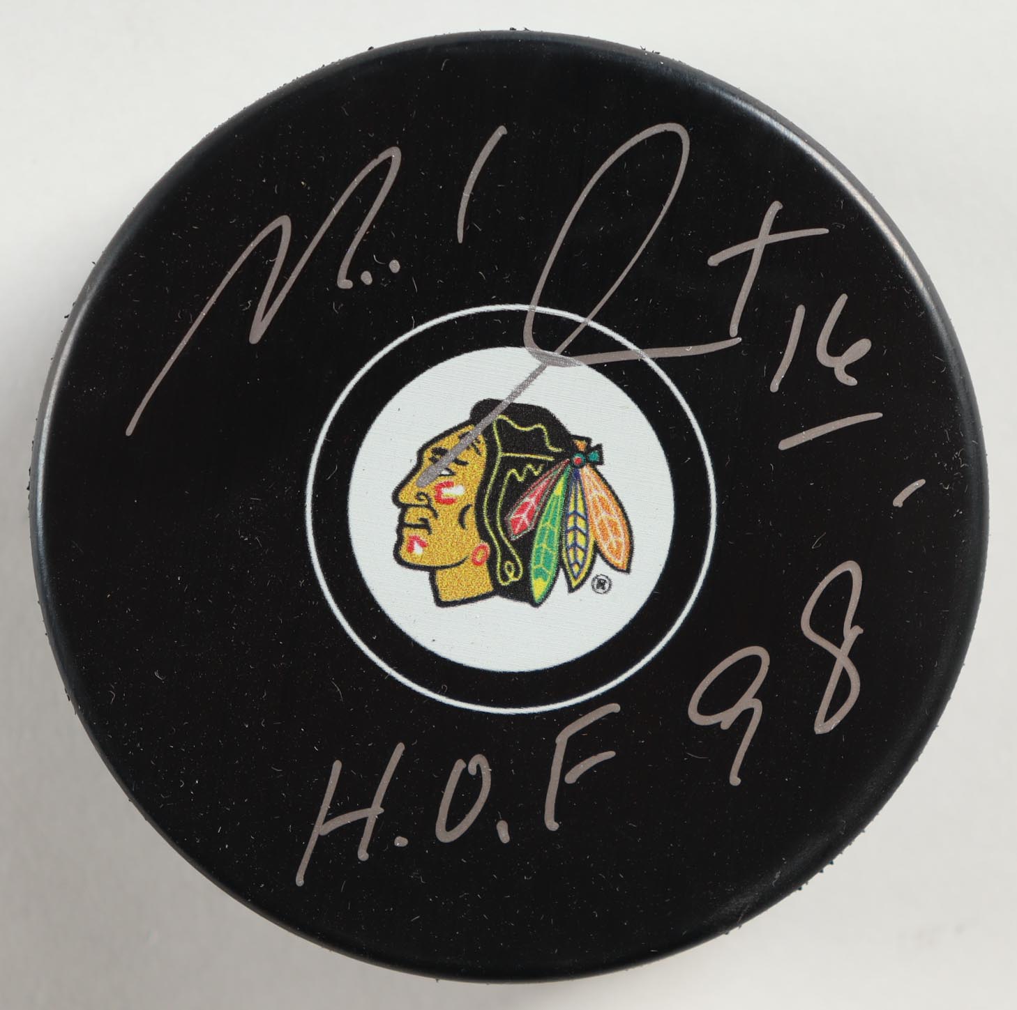 Michel Goulet Signed Blackhawks Logo Hockey Puck Inscribed "H.O.F. 98" (Premium Autographs)