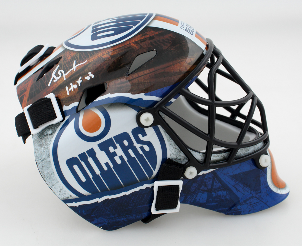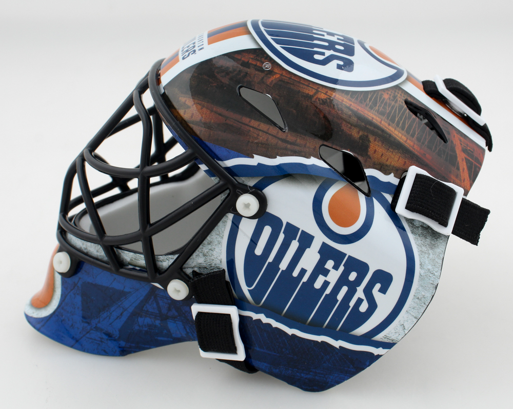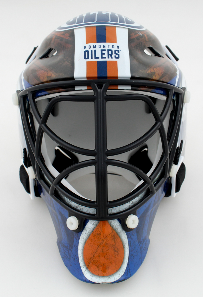 Edmonton Oilers full-size replica goalie mask. Hand-signed and inscribed by Grant Fuhr (HOF).