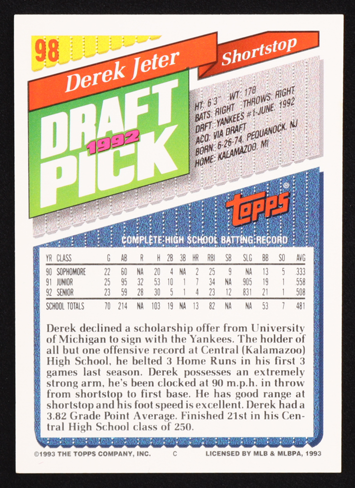 Derek Jeter 1993 Topps #98 RC