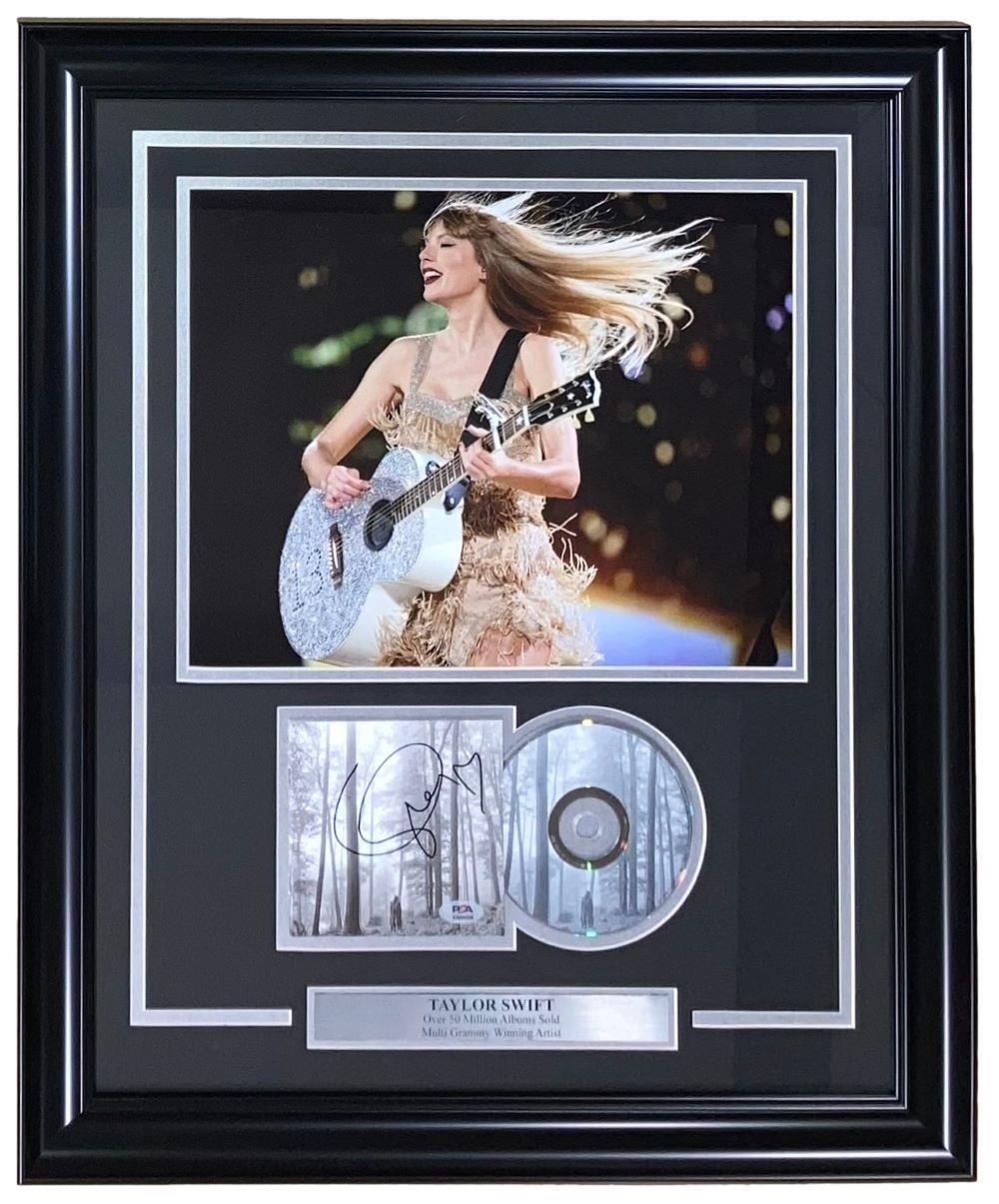 Custom frame measures approximately 21" x 24" in size. Features a "Folklore" CD insert that has been hand-signed by Taylor Swift. The display also includes the disc as shown.