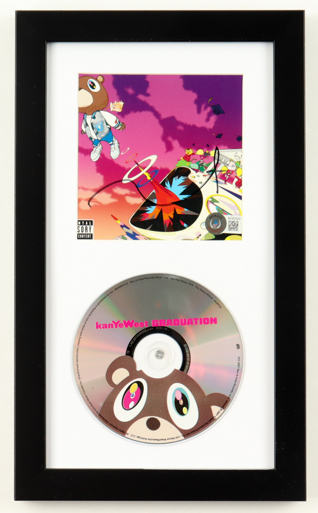 Custom frame measures approximately 8" x 13.5" in size. Features a "Graduation" CD insert that has been hand-signed by Kanye West. The display also includes CD.