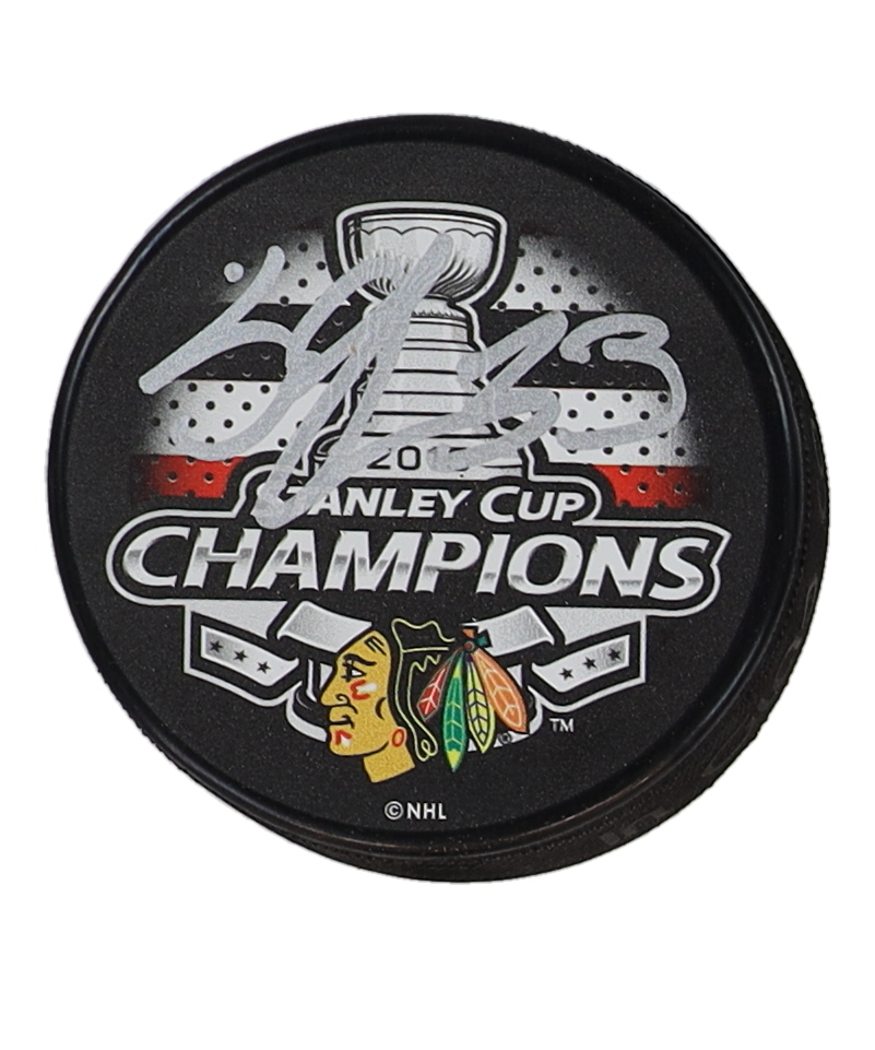 Chicago Blackhawks 2015 Stanley Cup Champions Logo Hockey Puck. Hand-signed by Scott Darling.