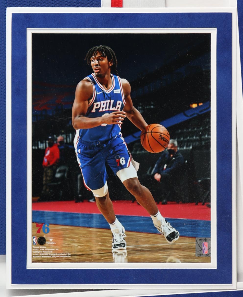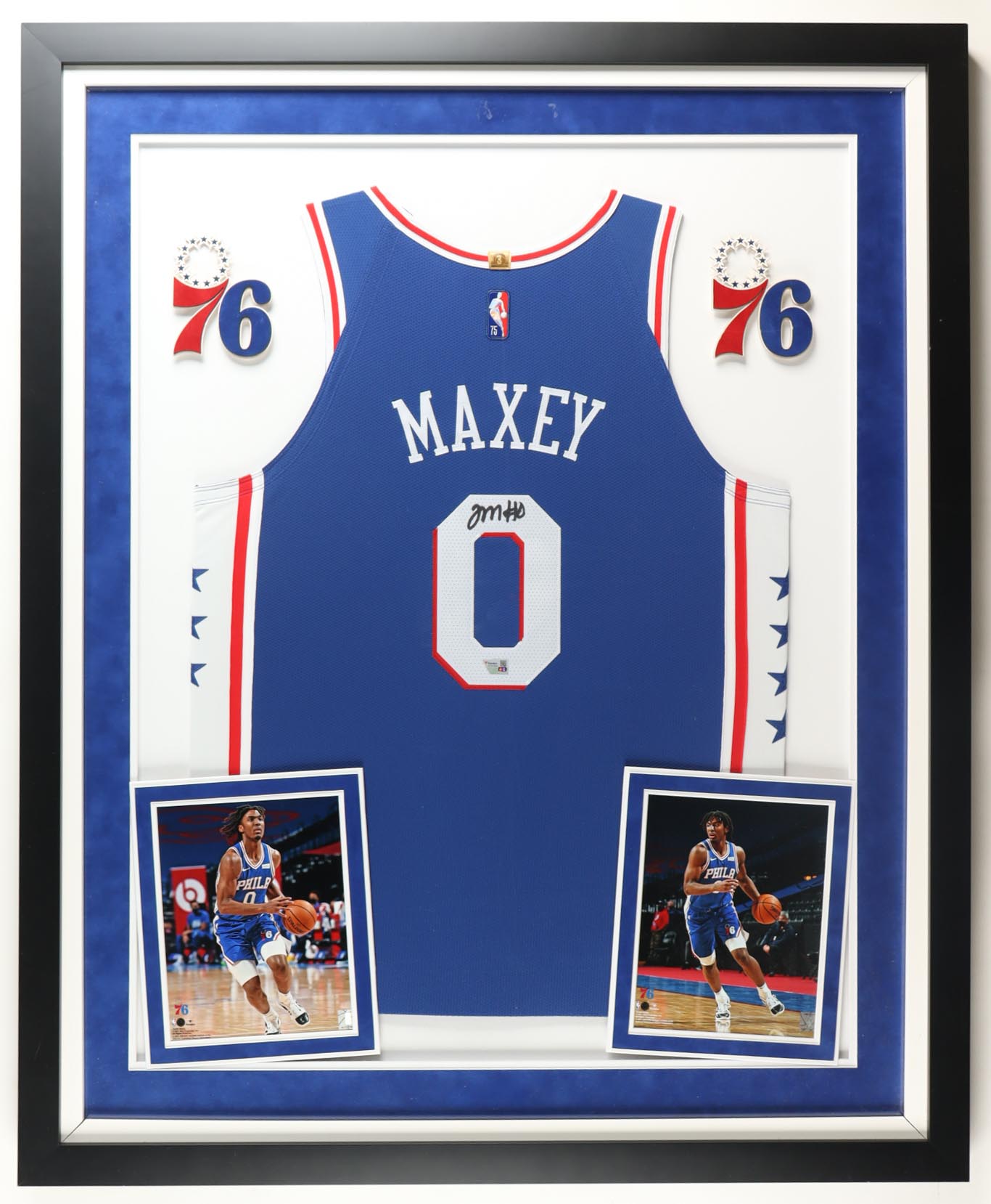 Custom frame measures approximately 34.5" x 42" in size and features a jersey that has been hand-signed by Tyrese Maxey.