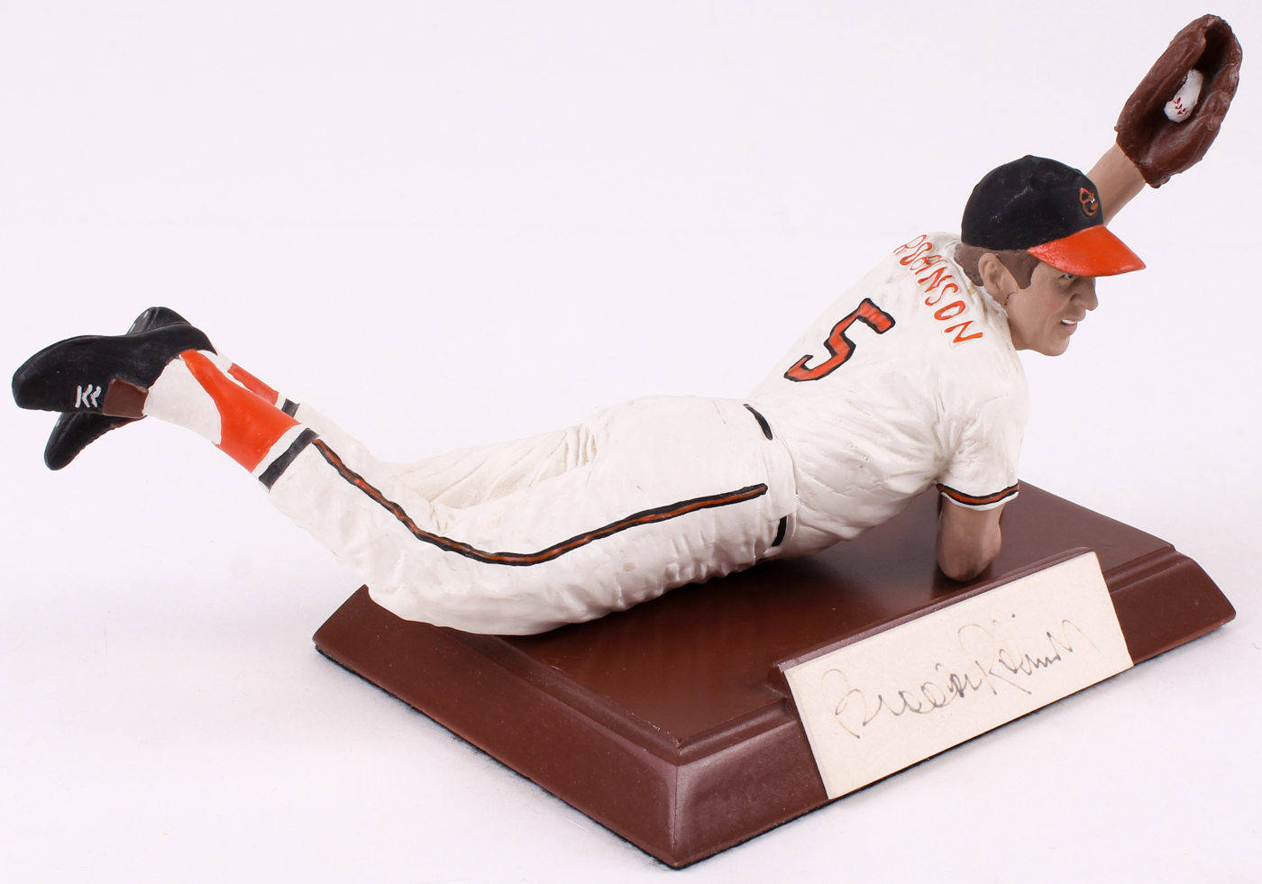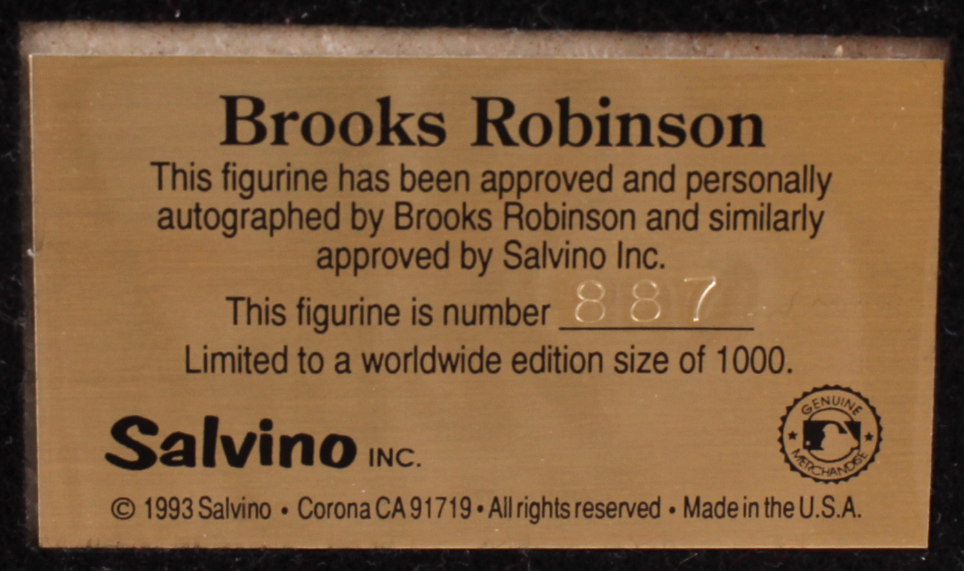 Salvino cold cast porcelain figurine measures 10" in length and features a cut that has been hand-signed in black felt-tip pen by Brooks Robinson (HOF). Figurine has been numbered limited edition #887/1000