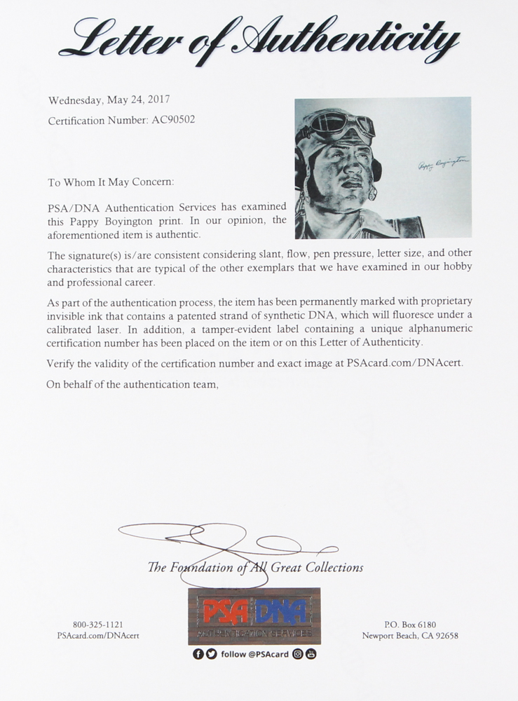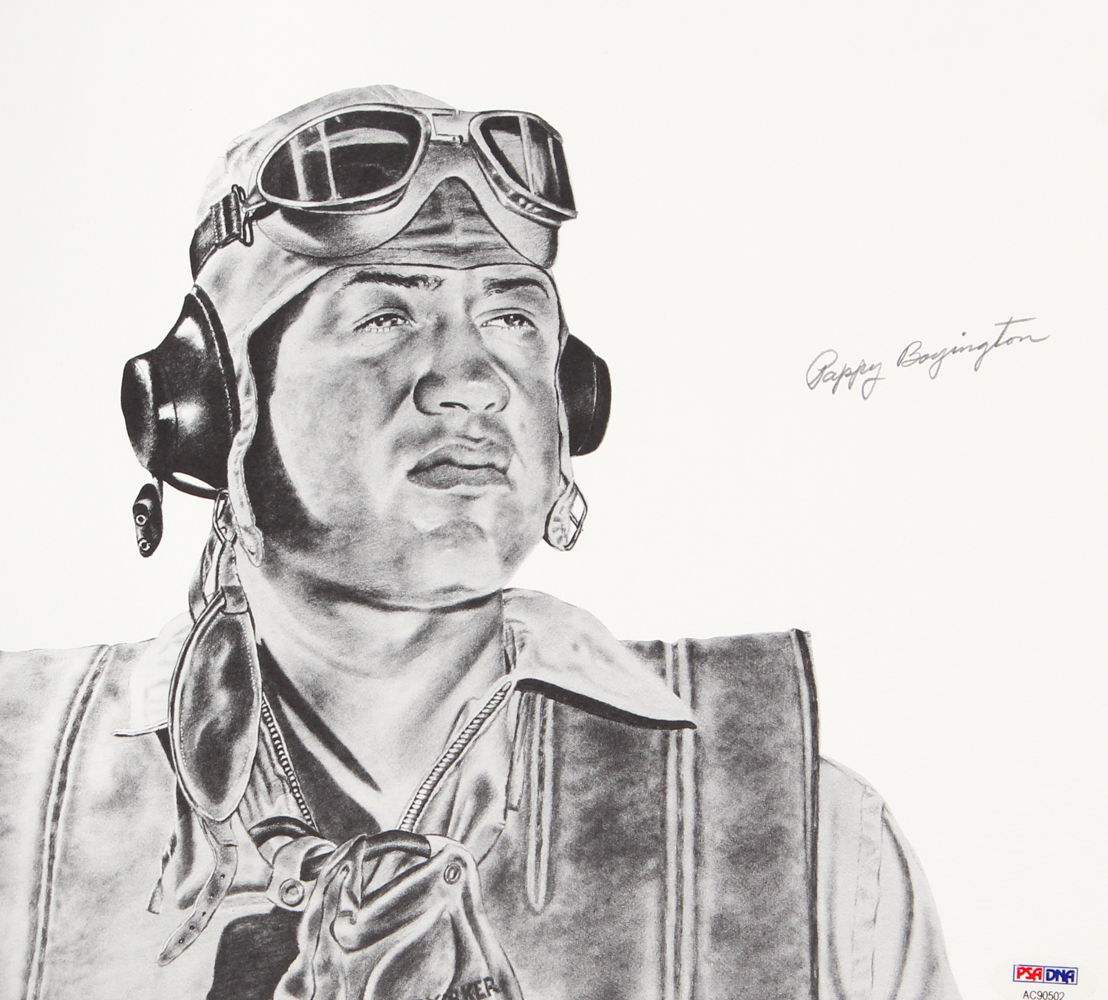 Pappy Boyington Signed 10x11 Lithograph (PSA LOA)