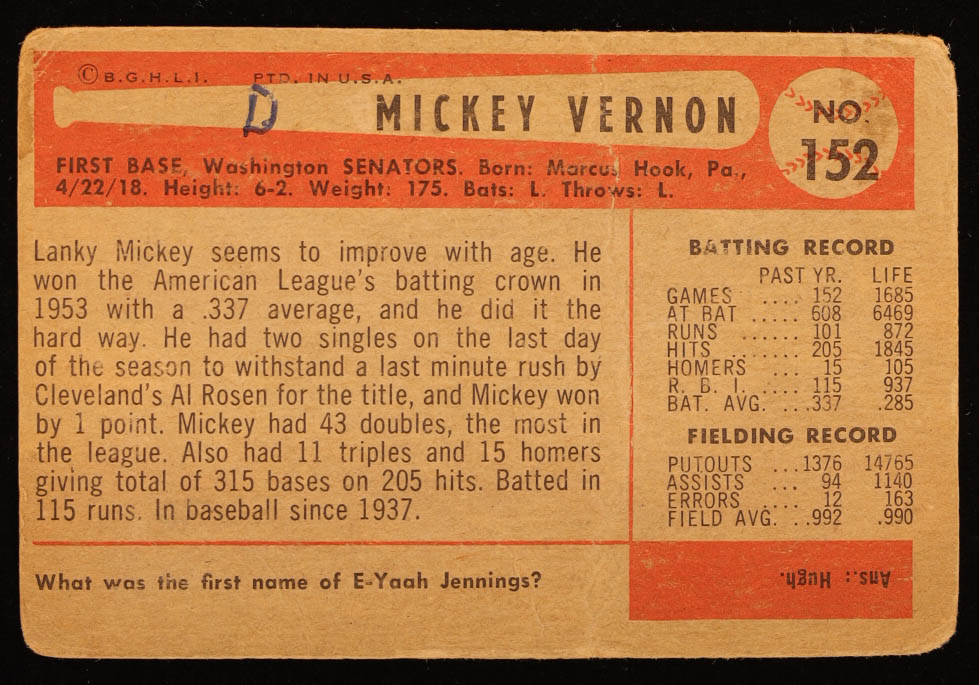 Please see photos for more details regarding the condition of the card (Washington Senators).