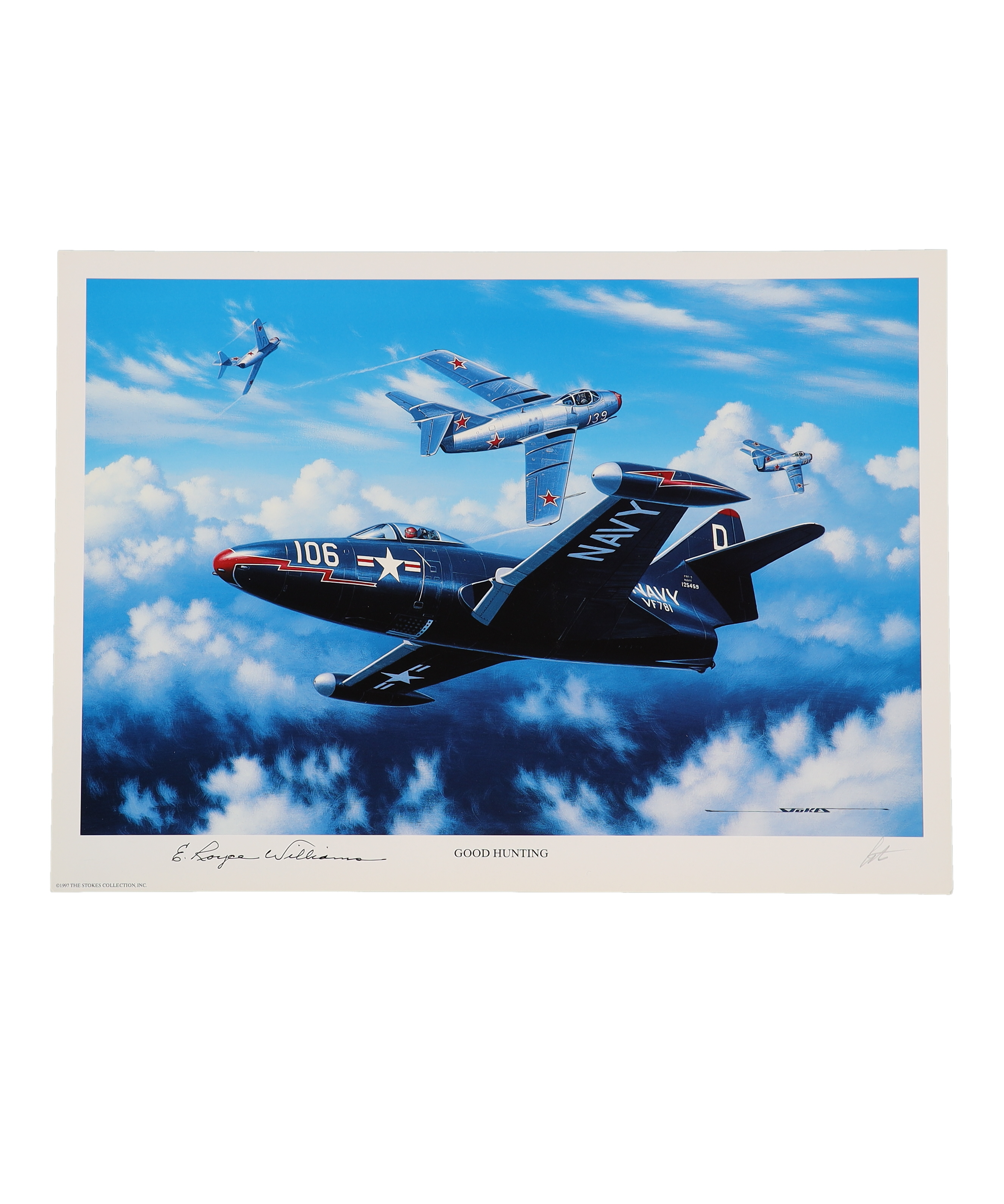 In """"Good Hunting,"""" Stan Stokes expertly captures the intensity and excitement of air combat during the Korean War. Against a backdrop of sweeping skies and billowing clouds, fighter jets streak through the air with lightning speed, showcasing the bravery and precision of the pilots who fought in the conflict.