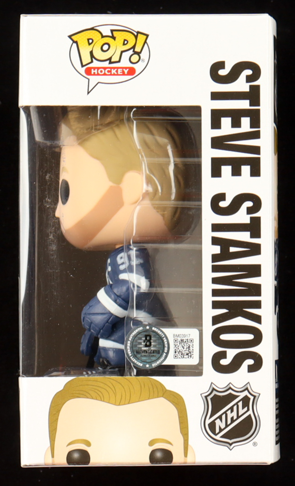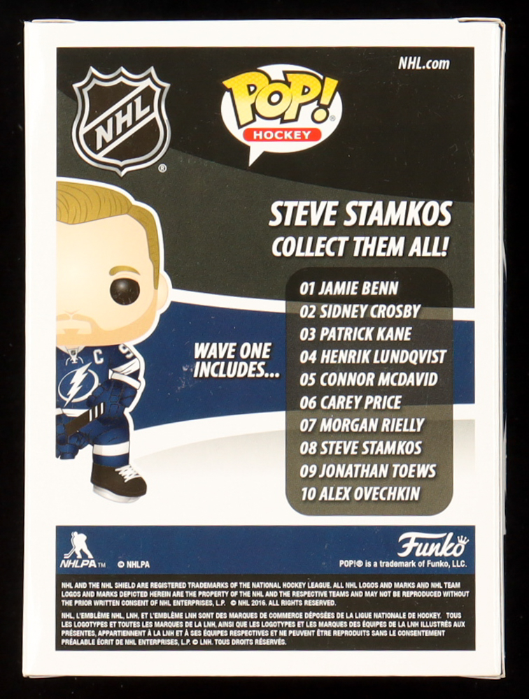 Vinyl figure measures approximately 4"and has been hand-signed on the packaging by Steven Stamkos (Tampa Bay Lightning). Please note, the front of the packaging has a light ink stain.