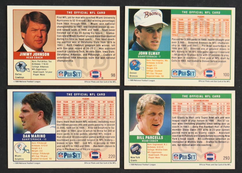 1989 Pro Set Football Series 1 Football Complete Set of (440) Cards with Joe Montana #381, Jimmy Johnson #98, Dan Marino #220, John Elway #100, Bill Parcells #293