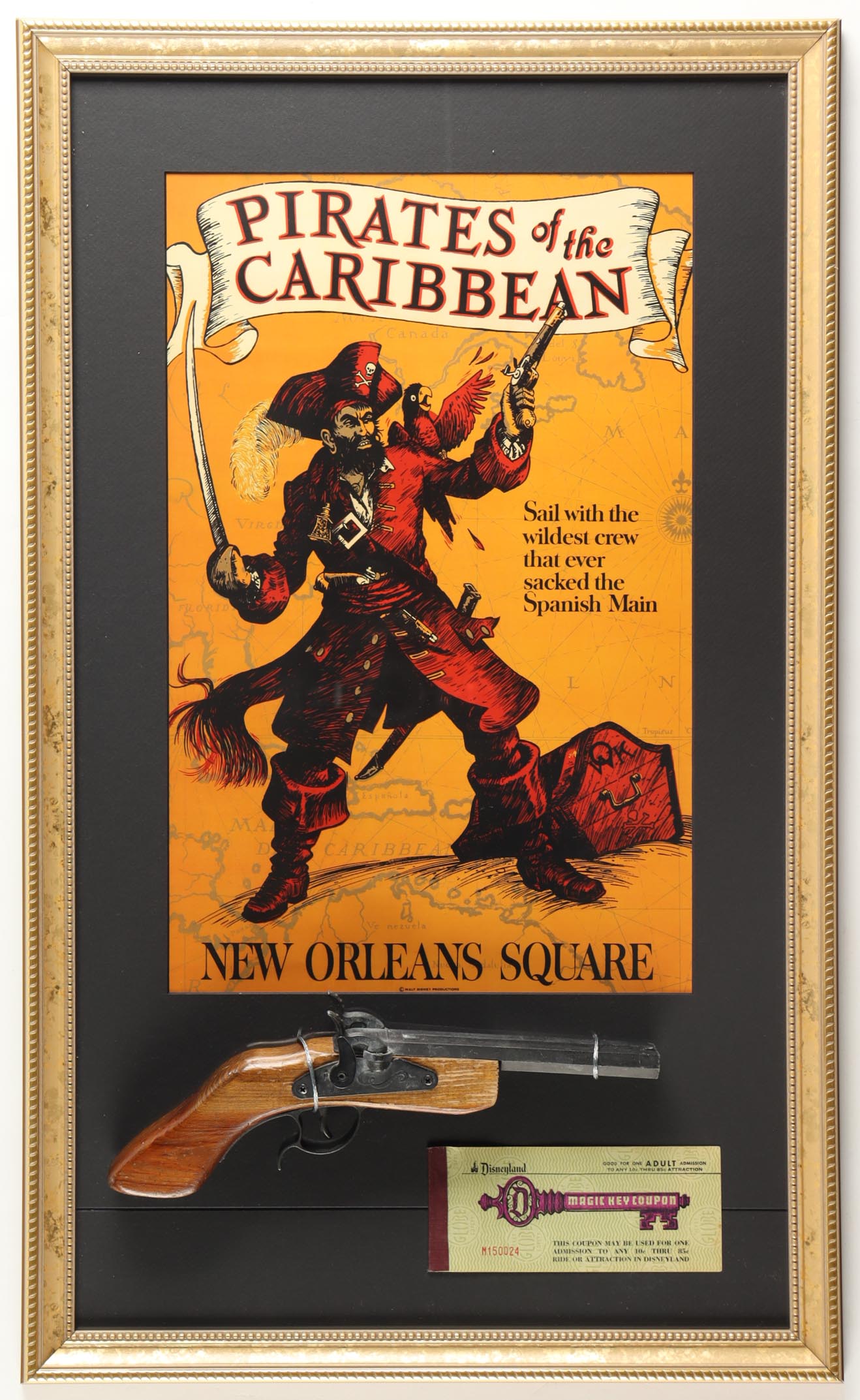 Disneyland "Pirates of the Caribbean" Custom Framed Ride Poster Print Display with Vintage Park Ticket & Replica Prop Pistol
