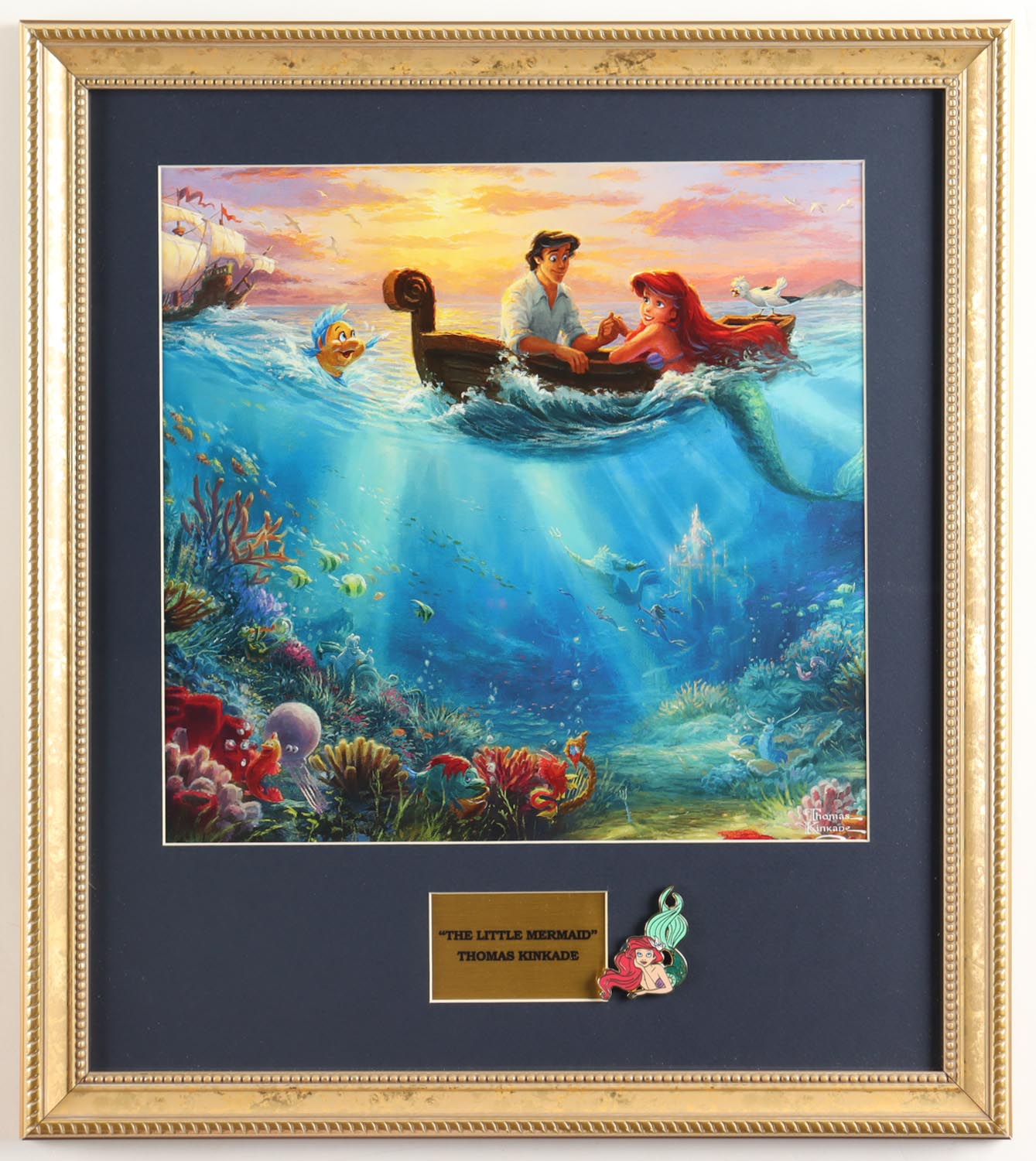 Custom frame measures approximately 16.25" x 18.25" in size and features an unsigned art print by Thomas Kinkade (D. 2012). The display also includes a Disney Ariel character pin. Please note, the display is unsigned.
