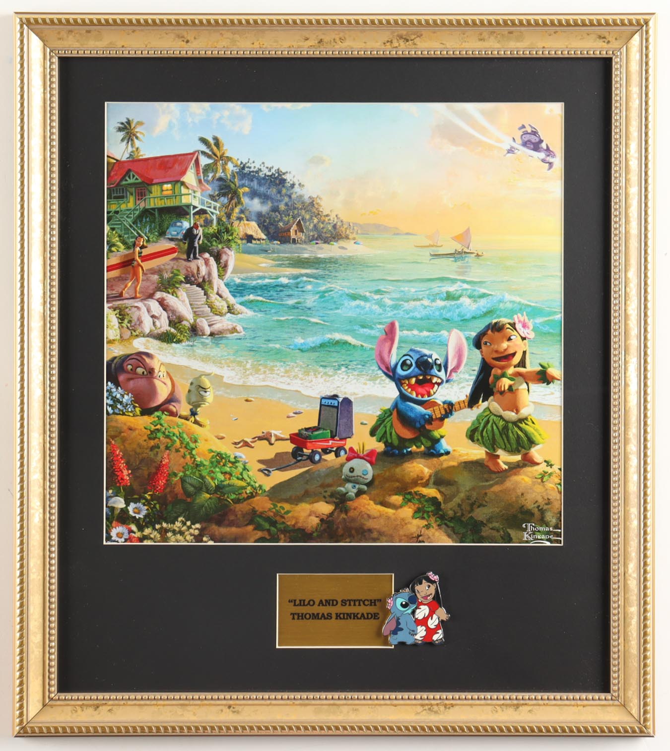 Custom frame measures approximately 16" x 18" in size and features a print of "Lilo & Stitch" by Thomas Kinkade (D. 2012). Display also features a Stitch and Lilo character Pin. Please note, the display is unsigned.