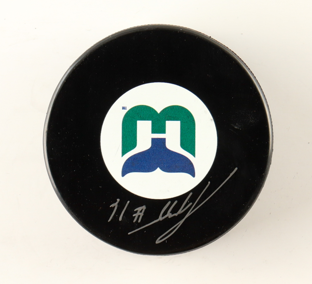 Hartford Whalers logo hockey puck has been hand-signed by Sylvain Turgeon.