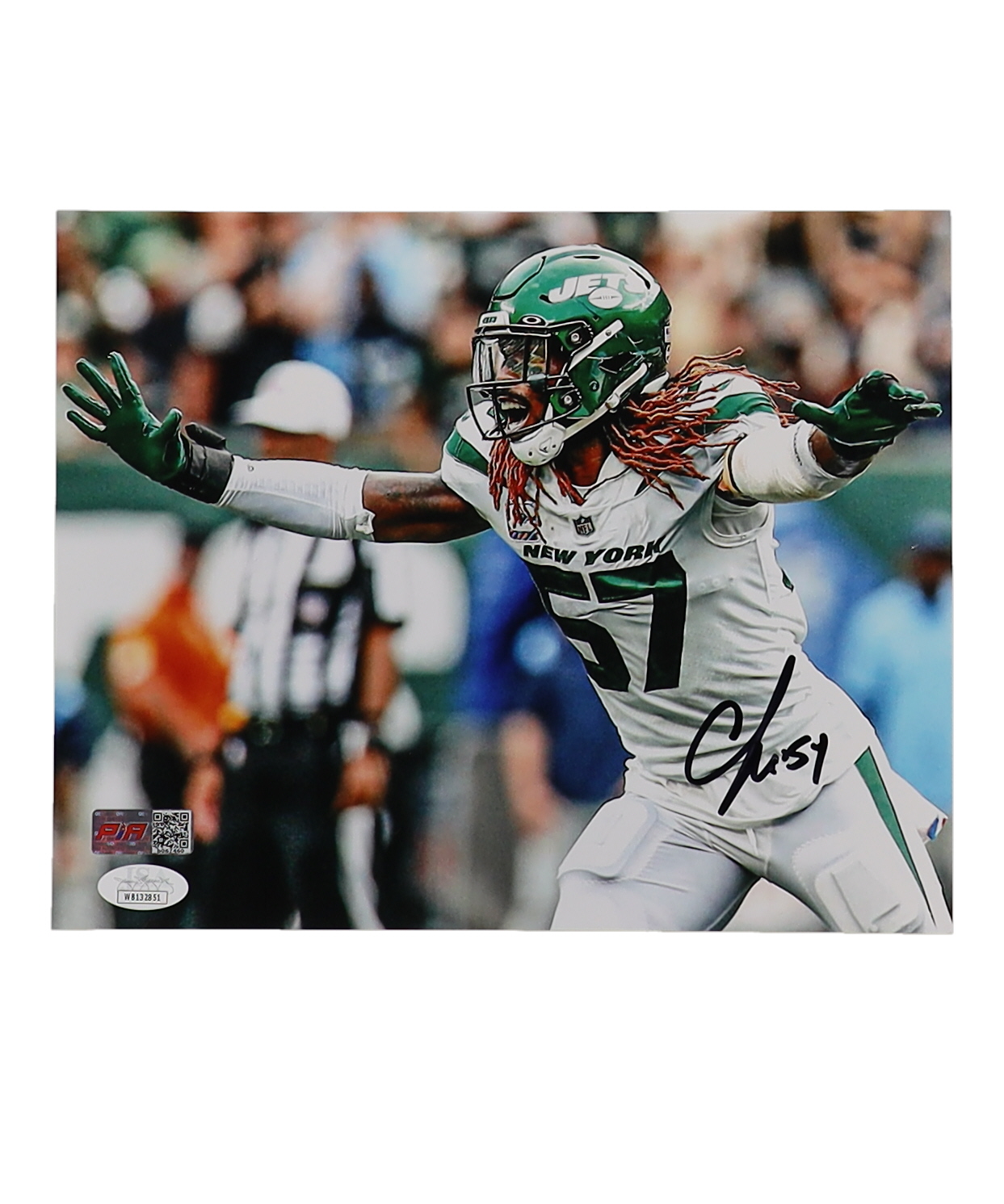 Photo measures 8" x 10" in size and has been hand-signed by CJ Mosely (New York Jets).
