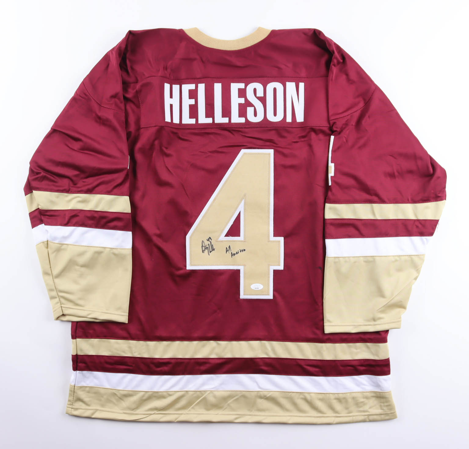 Custom jersey. Everything is sewn on, size XL. Hand-signed and inscribed by Drew Helleson. Please note, there is staining to the right of the reverse number.