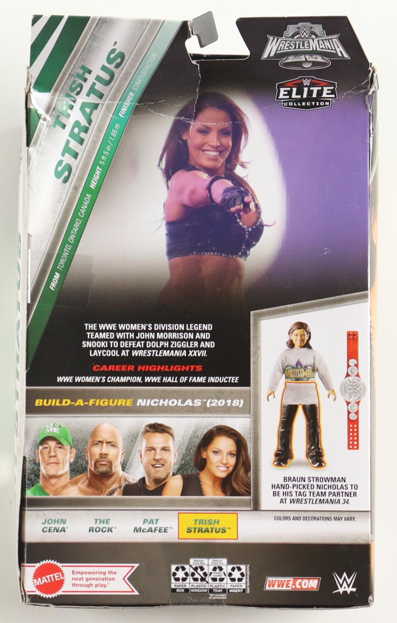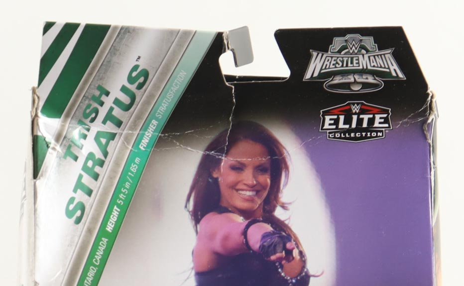 Mattel WWE Elite Collection Action figure measures approximately 7" in height and has been hand-signed and inscribed on the packaging by Trish Stratus (HOF). Includes original packaging as shown. Please note, there is creasing, scuffing, and edge wear on the packaging, see photos for more details.