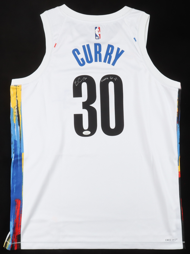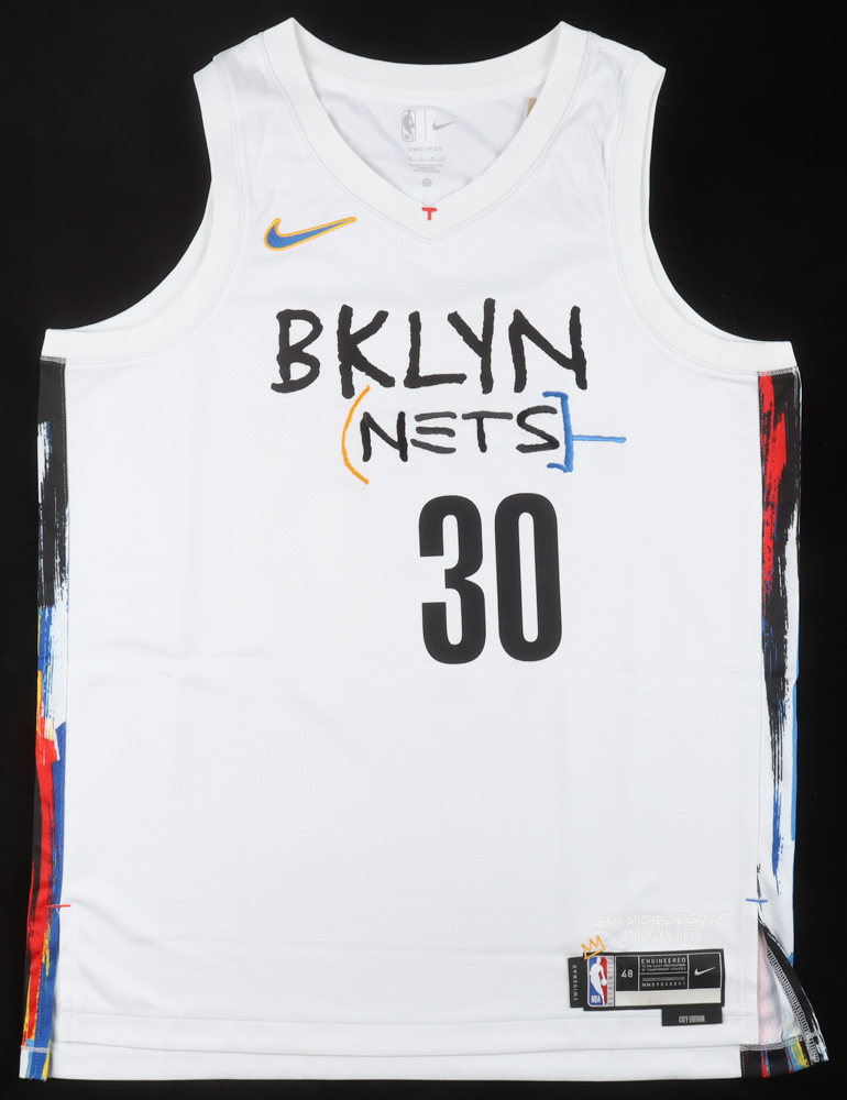 Nike jersey. Everything is pressed on, size 48. Hand-signed and inscribed by Seth Curry (Brooklyn Nets).